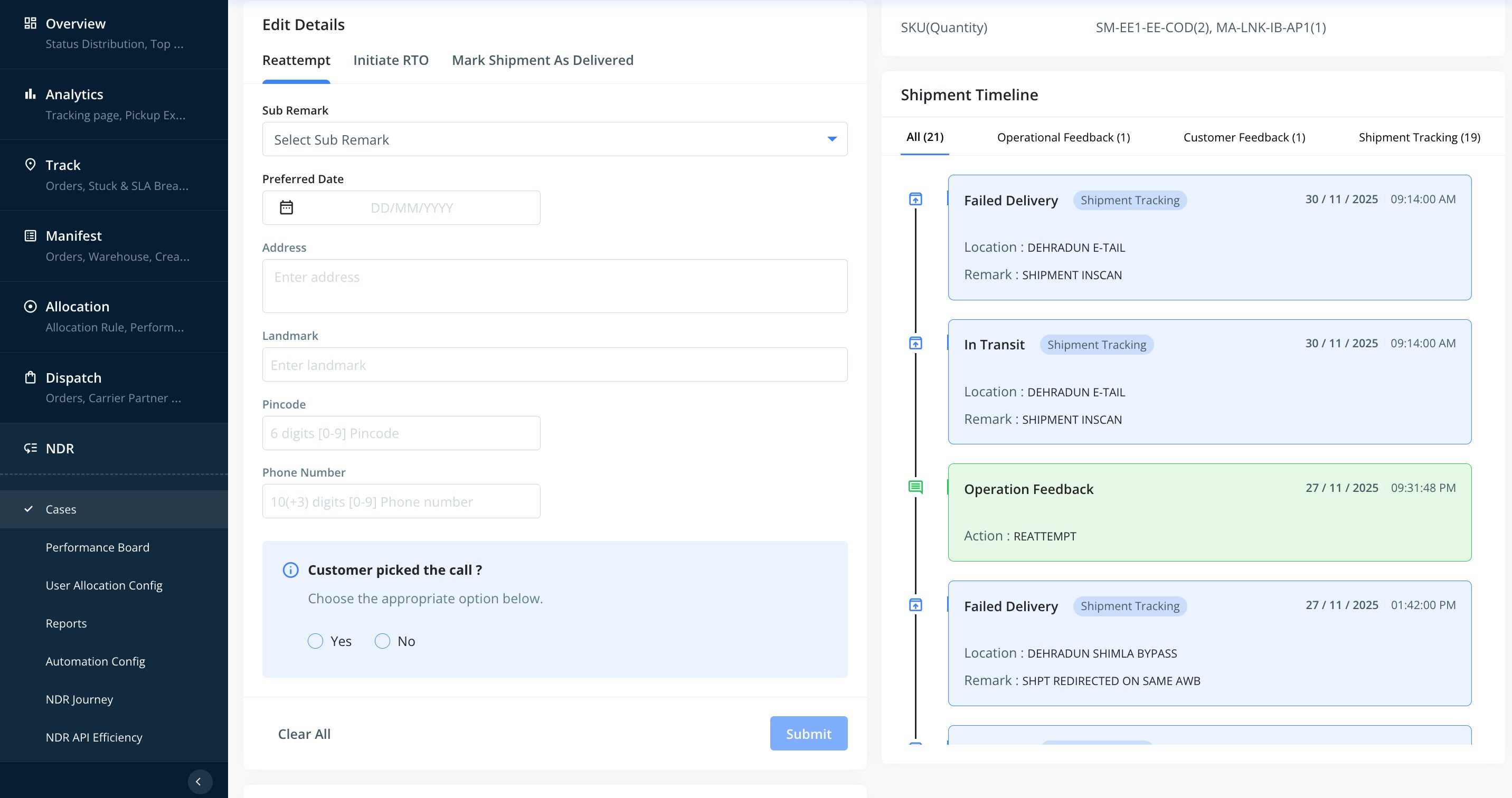 Support agents can update customer responses and take NDR actions (Reattempt / RTO) directly from the tracking view. These actions will be shared with the courier just like in the standard NDR Management workflow.
