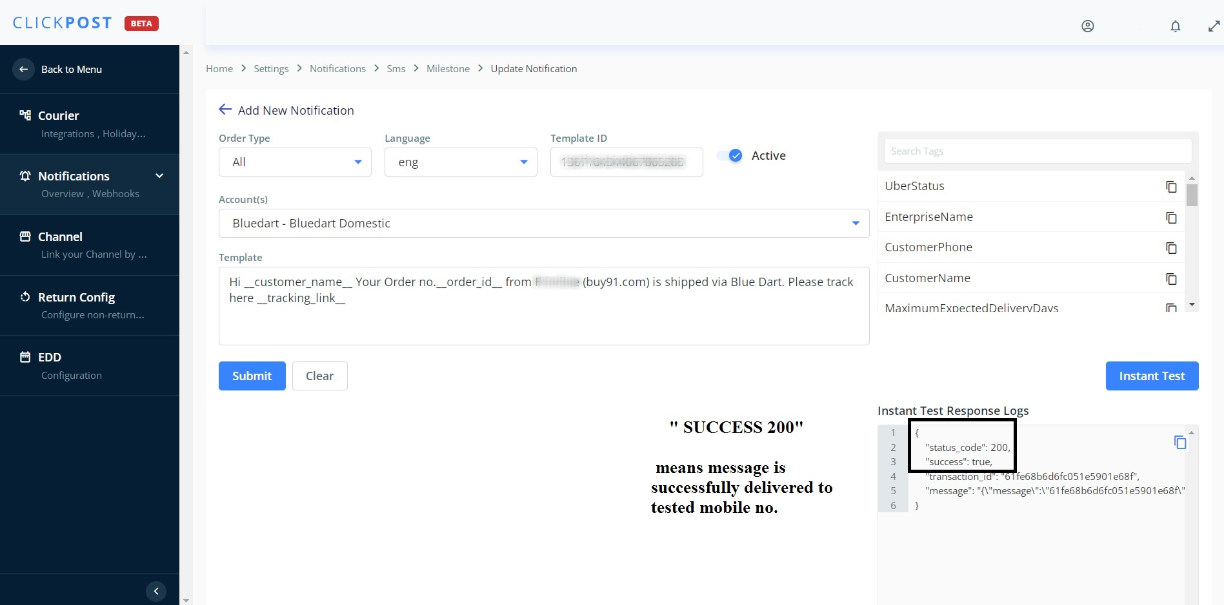 10. Click on the Instant Test tab and put in a sample mobile no. with +91 (country code) you shall receive a success message with status 200 and a text message on the entered mobile number.