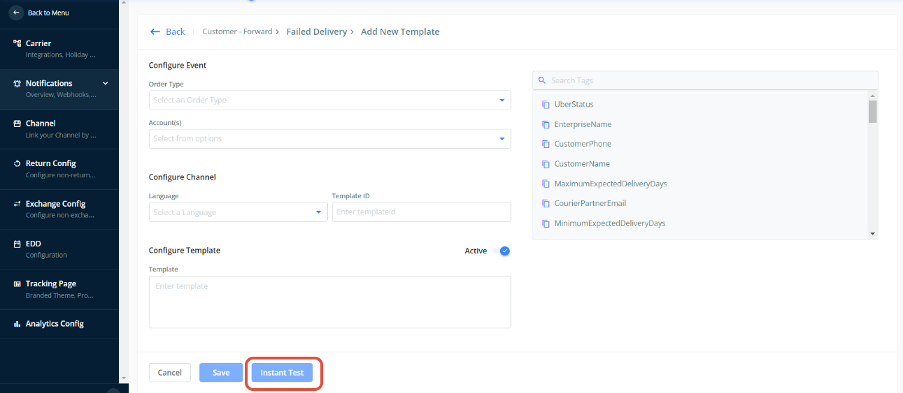9. Once you submit, click on the Instant Test (To check if the configured template is working fine or not) .