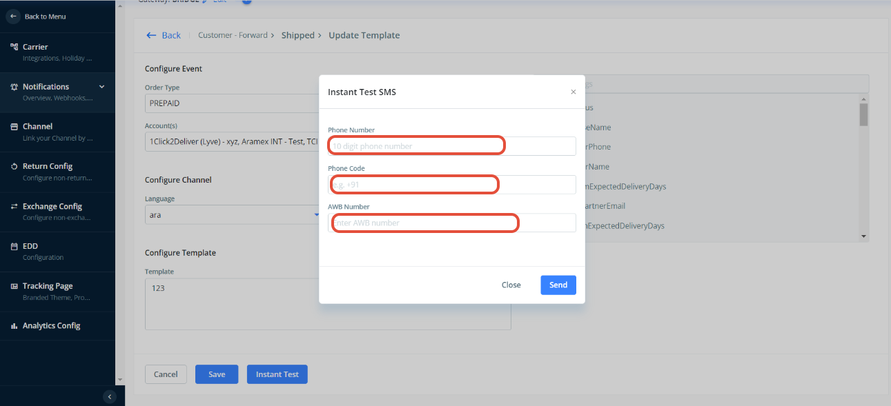 2. To check notifications for reverse flow , please use AWB number which was registered in you dashboard with "reverse courier partner", for forward flow , please use AWB number which was registered in you dashboard with "forward courier partner" for "Instant Test"