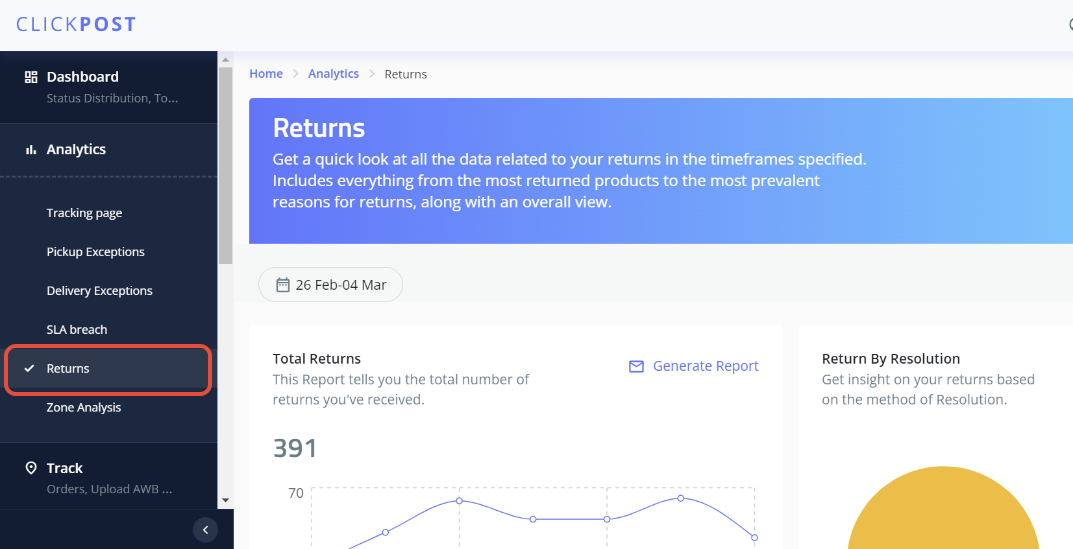 We have a dedicated section on the ClickPost dashboard's Analytics page where you can quickly review all the information pertaining to your returns within the designated time periods.