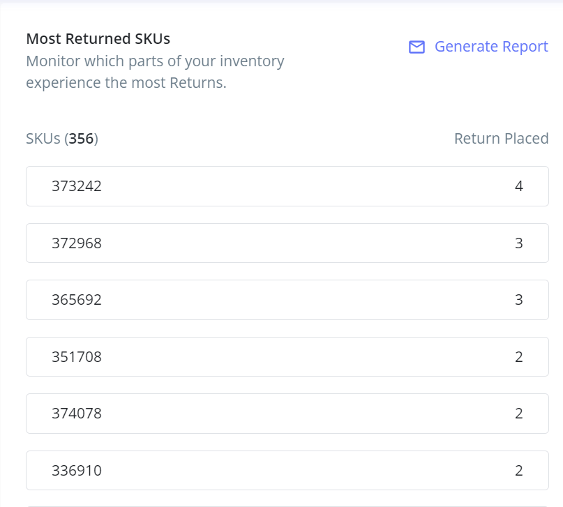 3) Most Returned SKUs: This section will help you in keeping track of the SKUs that correspond to the areas of your inventory that see the most returns.