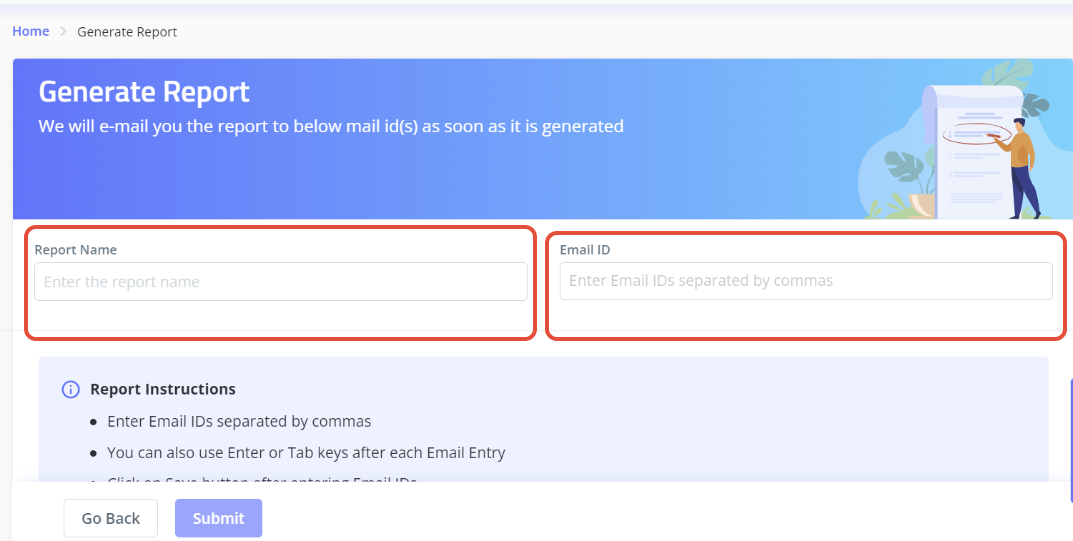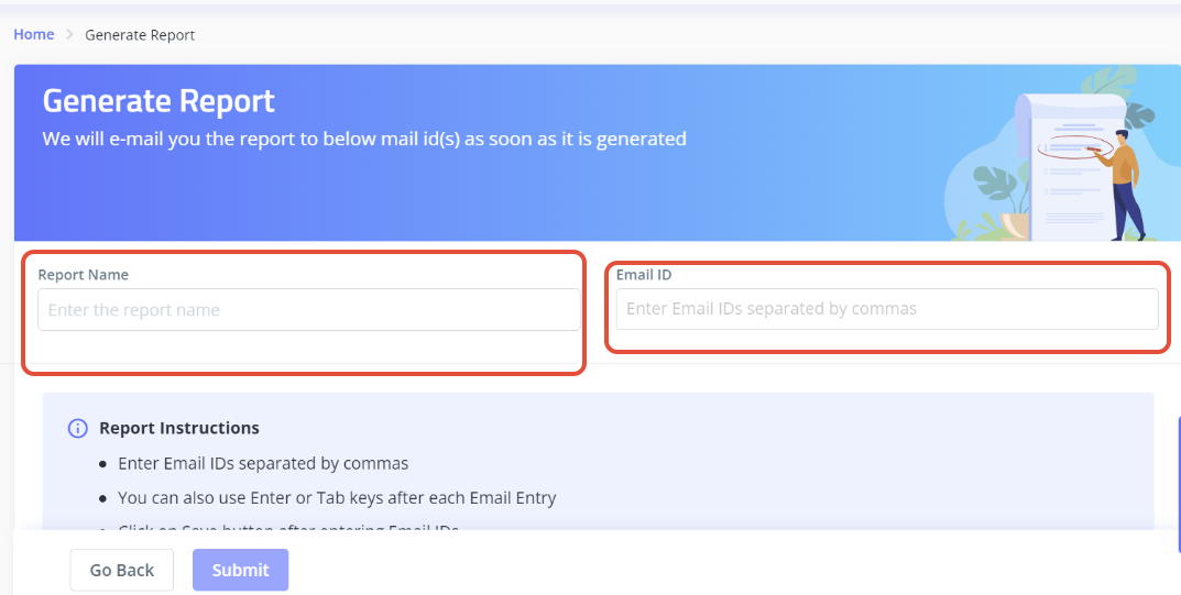 You must input a report name (which can be arbitrary) and the email addresses on which you want the report to be triggered under the "Generate Report" section. It is possible to use multiple email addresses, but please make sure they are all comma separated.