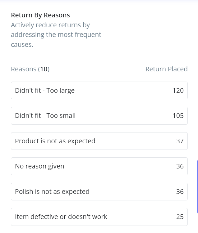 4) Return By Reasons: This section will help you to actively reduce returns by addressing the most frequent causes.