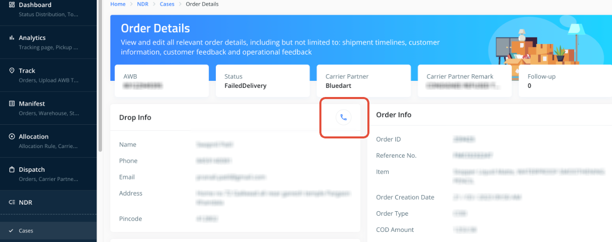 You can trigger customer calls for NDR cases directly from the ClickPost dashboard using the Click-to-Call option. This allows your team to instantly connect with end customers and gather the required feedback to resolve failed deliveries faster.