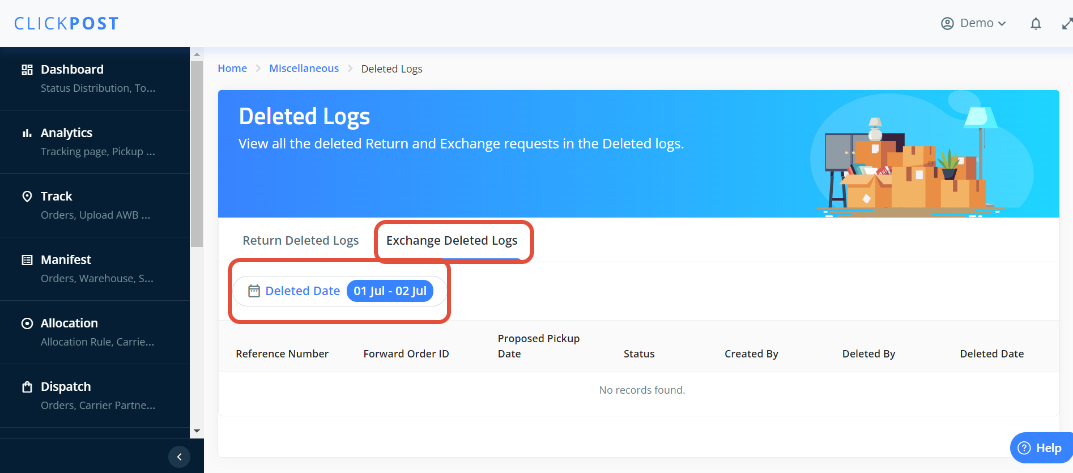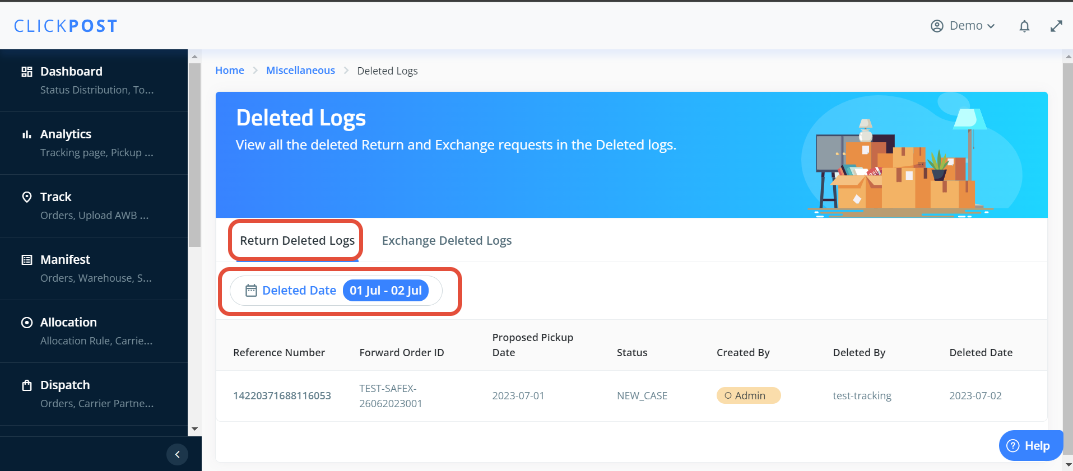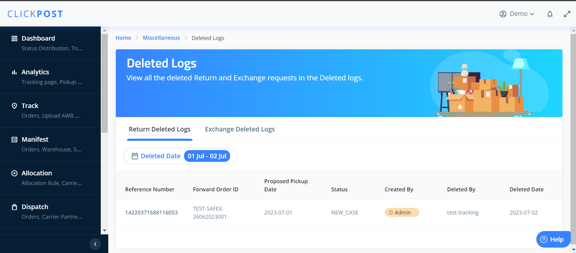 We have a dedicated section on the ClickPost dashboard where the Deleted Return and Exchange details can be viewed.
