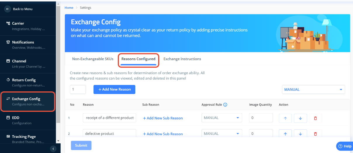 We have a dedicated section on the ClickPost dashboard wherein Customers can add the exchange reasons that should be displayed on the tracking page