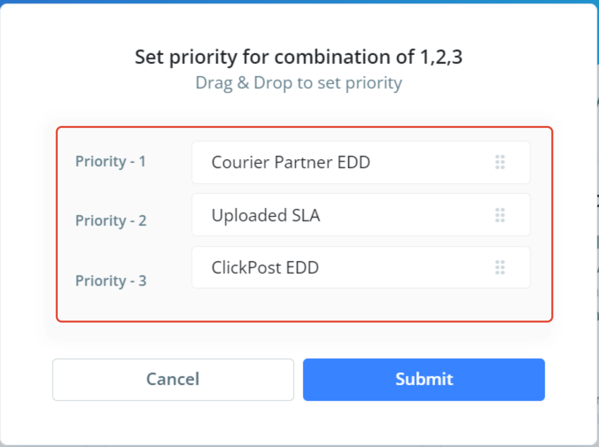 - Combination EDD: Activating this option will assist in merging the other three components in a prioritized sequence to calculate the Expected Delivery Date (EDD) in accordance with your specific requirements. You have the flexibility to establish a priority sequence for obtaining the Expected Delivery Date (EDD). The first priority can be assigned to the courier partner's EDD, followed by the uploaded SLA as the second priority, and ClickPost EDD as the third priority.
