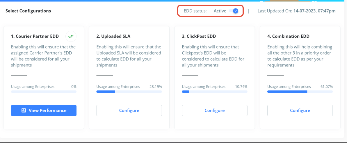 - ClickPost EDD: Enabling this feature ensures that Clickpost's Expected Delivery Date (EDD) is factored into the calculation of the Expected Delivery Date for all your shipments.