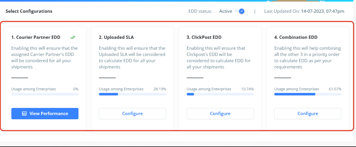 We have a dedicated section on the ClickPost dashboards in the "EDD" section where you can examine the existing Expected Date of Delivery settings, make edits or adjustments to align with updated requirements, and access analytics to assess the performance of your configuration.