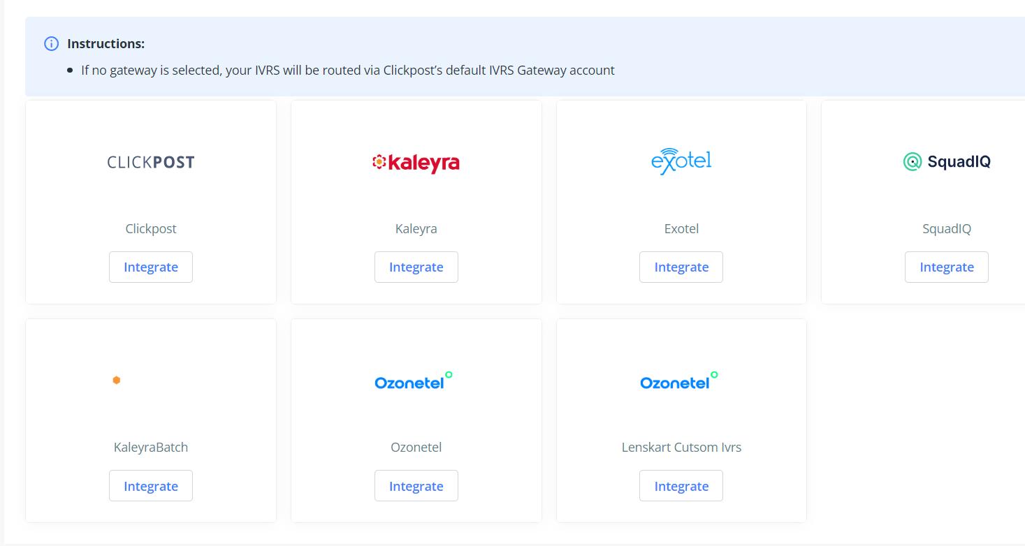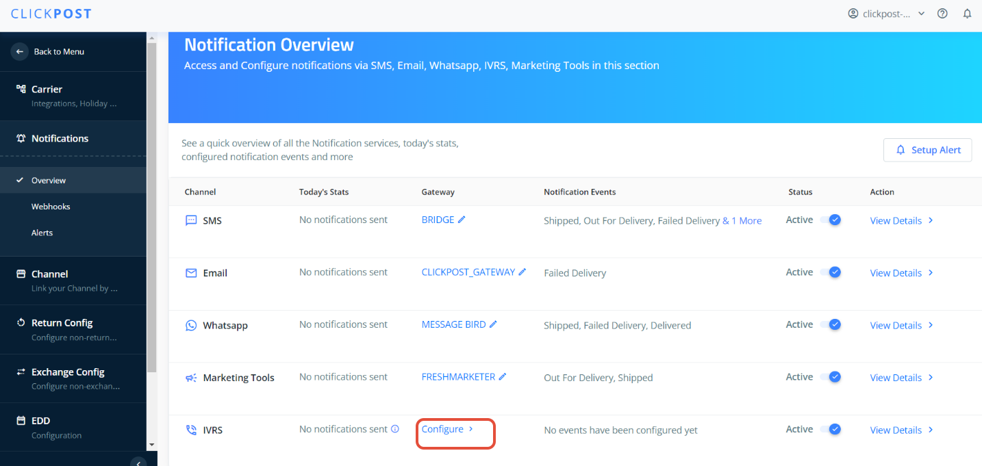 1. IVRS gateway credentials: Please go to Notifications >> Overview >> IVRS to configure IVRS gateway on Clickpost dashboard and provide IVRS call script to Clickpost team. Please note, the script will involve the message you wish to play to your customers and how you are going to take the feedback.