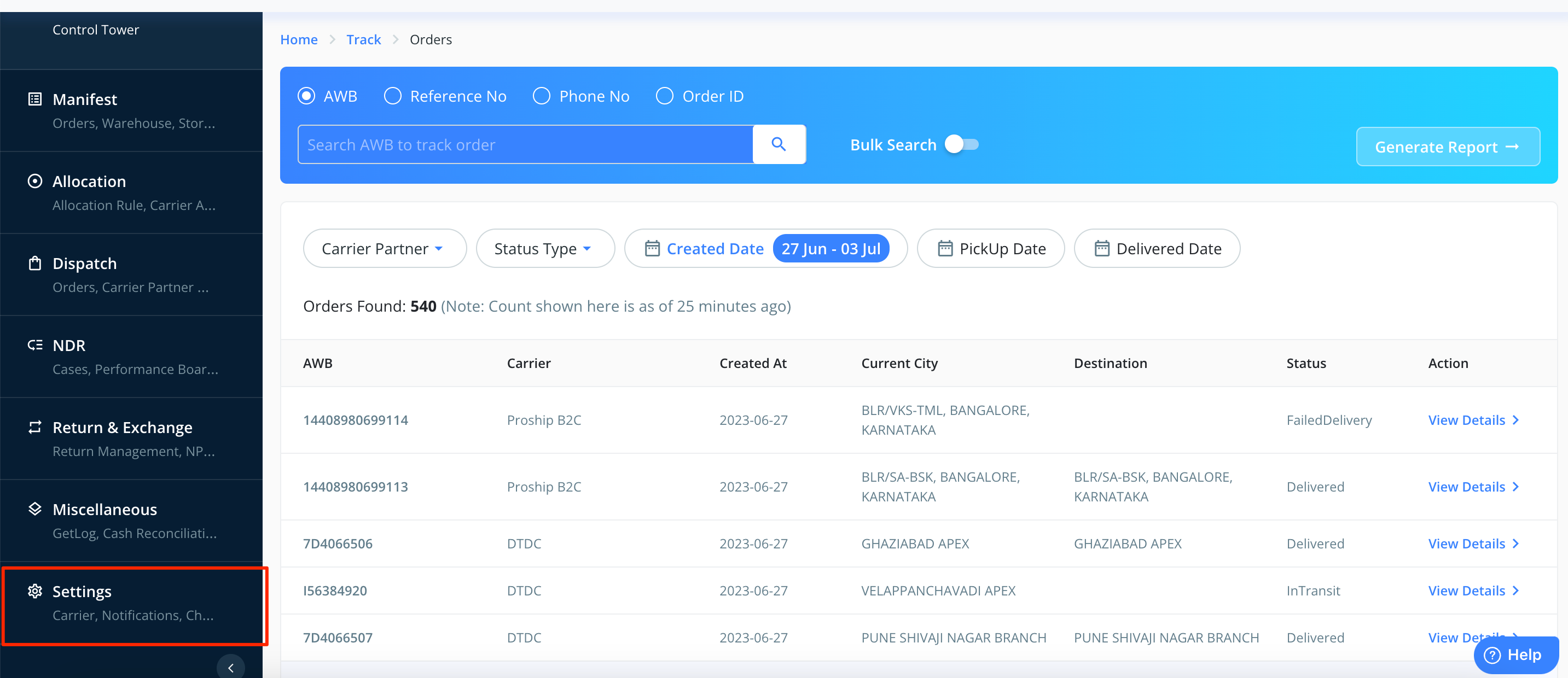 1. Login into the Clickpost dashboard using the URL: https://dashboard.clickpost.ai/ and go to settings.