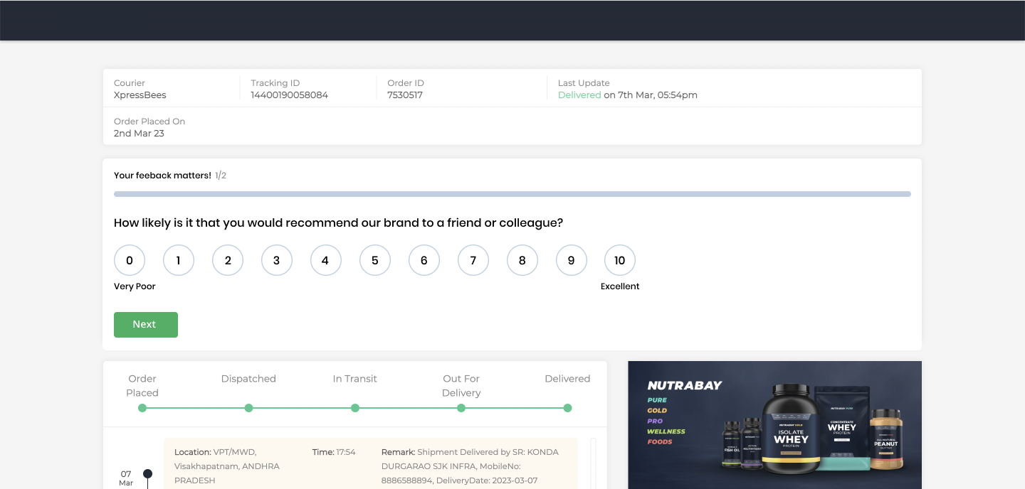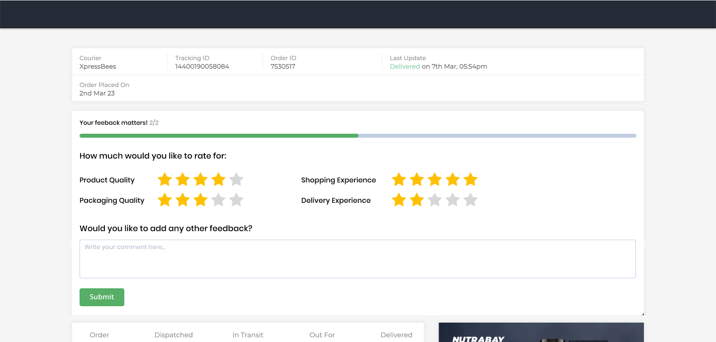 You can enable survey notifications to capture customer feedback on key factors like product quality, shopping experience, packaging, and delivery experience. These notifications are triggered after the shipment is delivered, with flexible scheduling options to suit your brand’s needs.