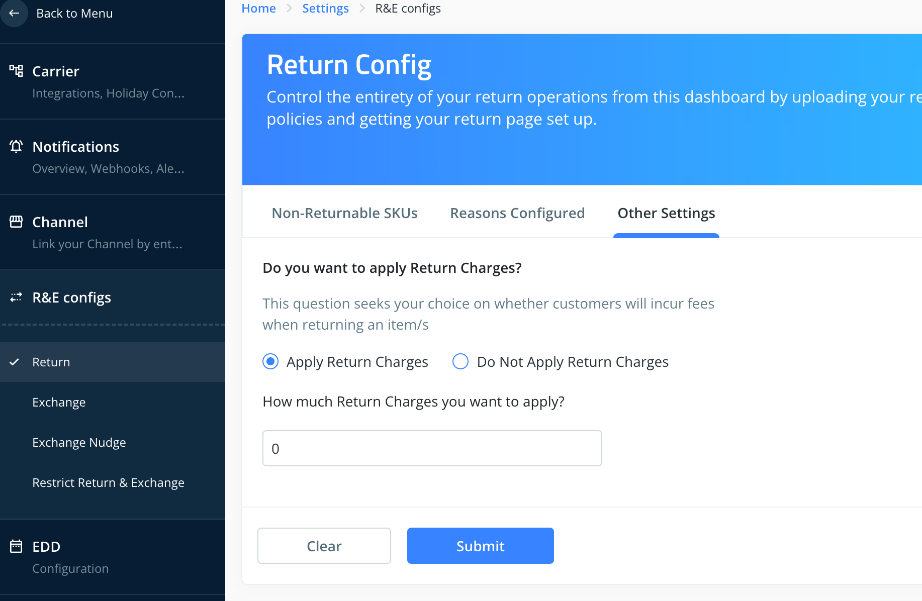 2. Under R&E config, Click on Returns and then select "other settings"