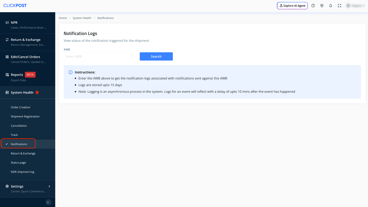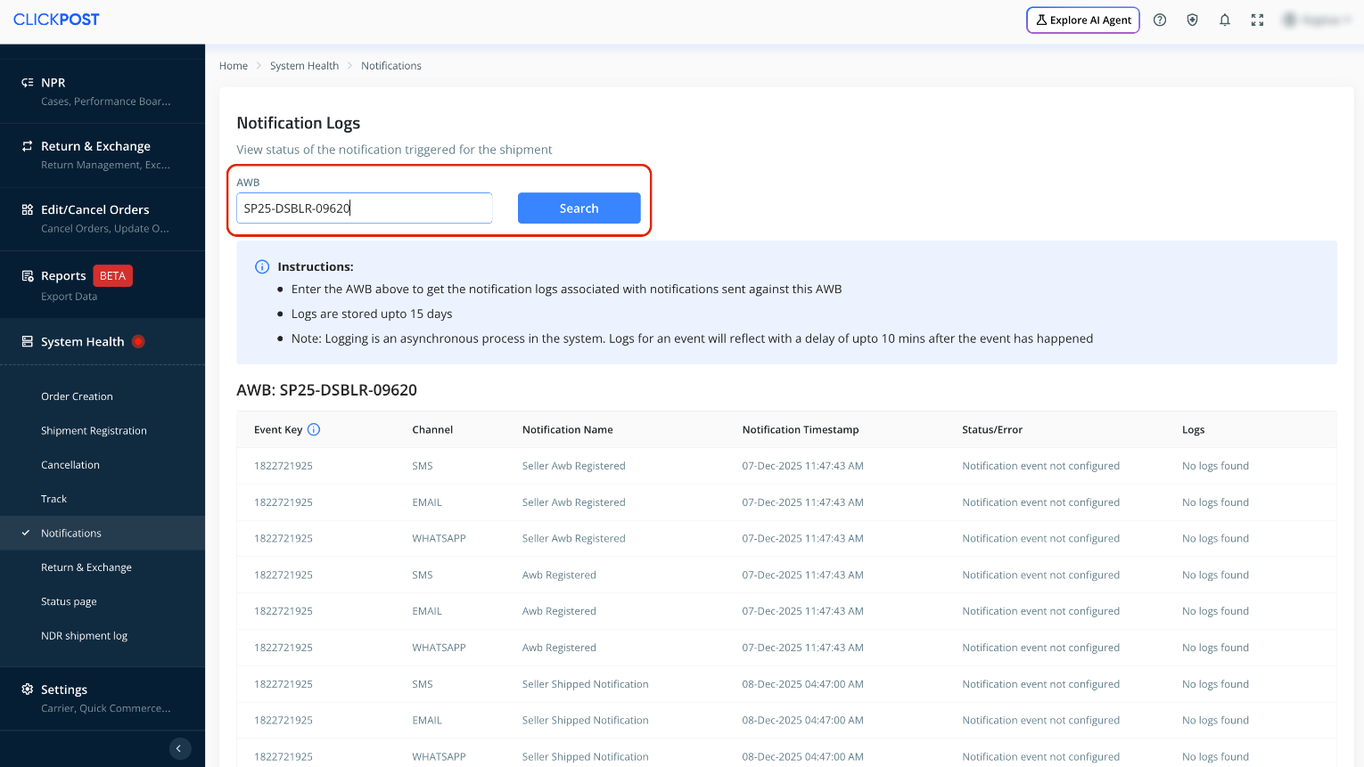 3. Enter the AWB in the "Enter AWB" field and Click on "search" to find the logs of all the notifications triggered.