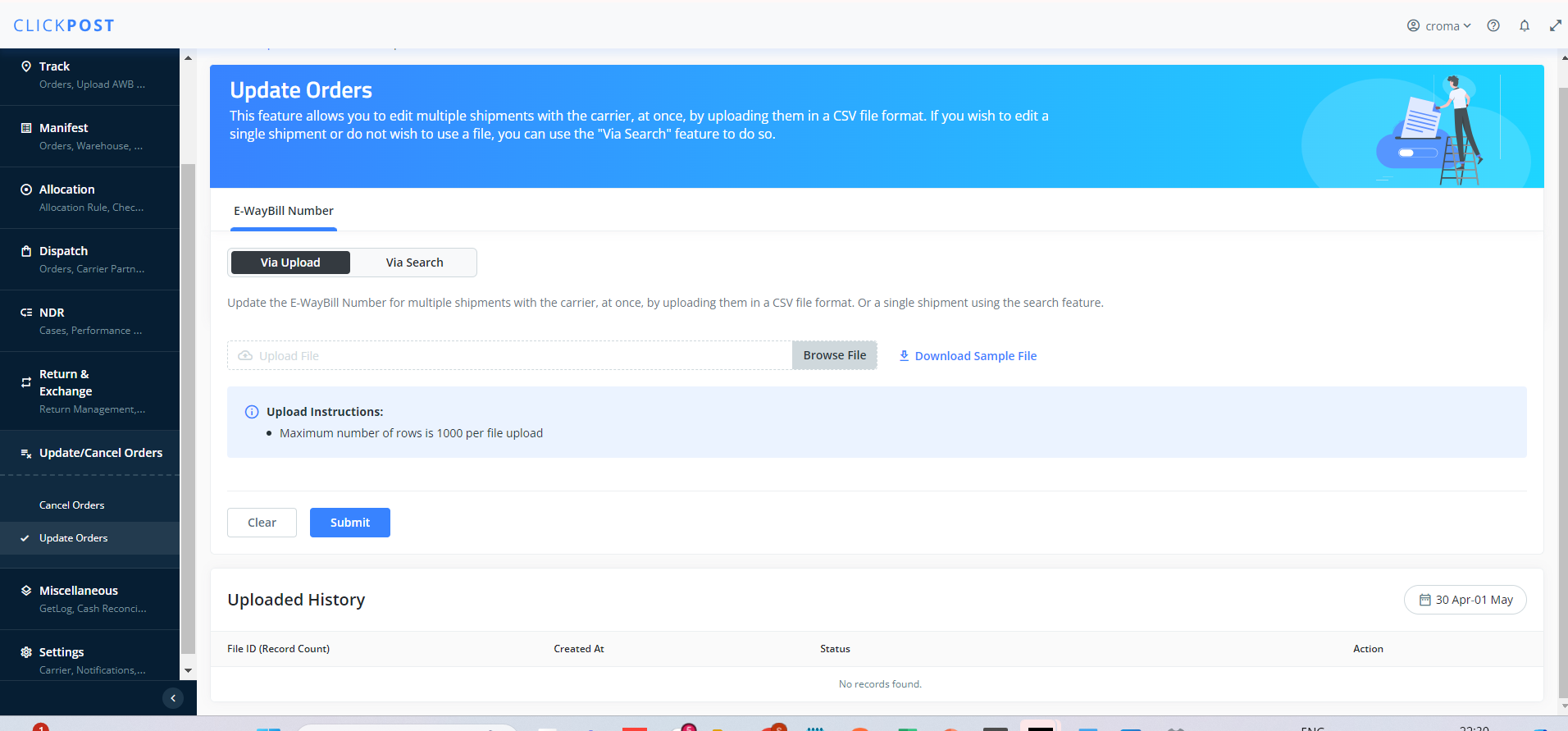 If your shipment has an invoice value above ₹50,000, you can update the E-Waybill number using the Update Order module.