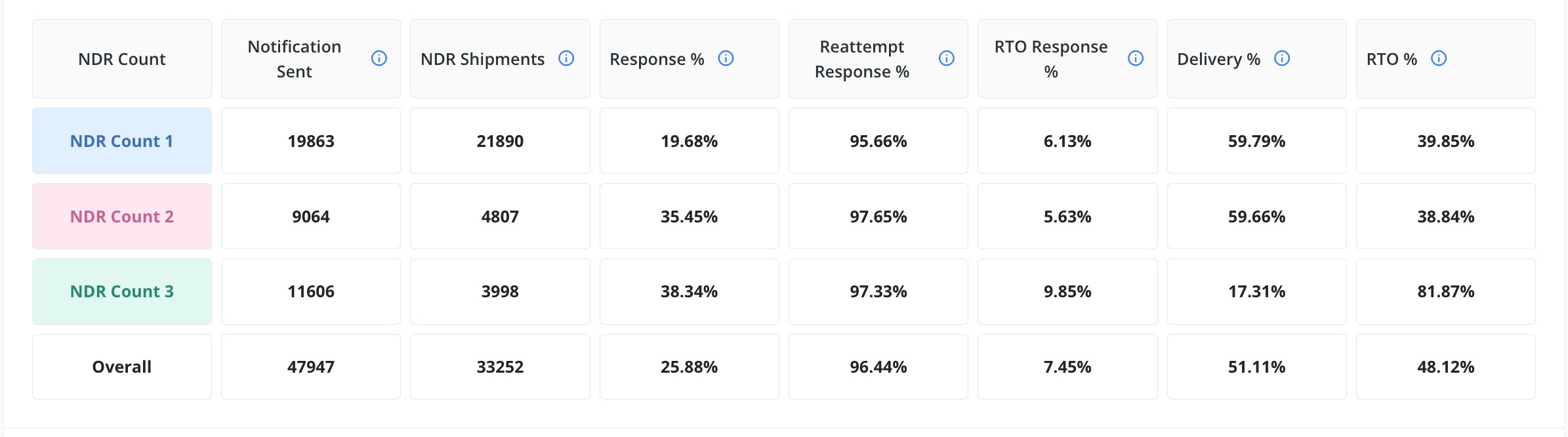 - Delivery %: This metric shows the percentage of NDR shipments successfully delivered out of the total NDR shipments.