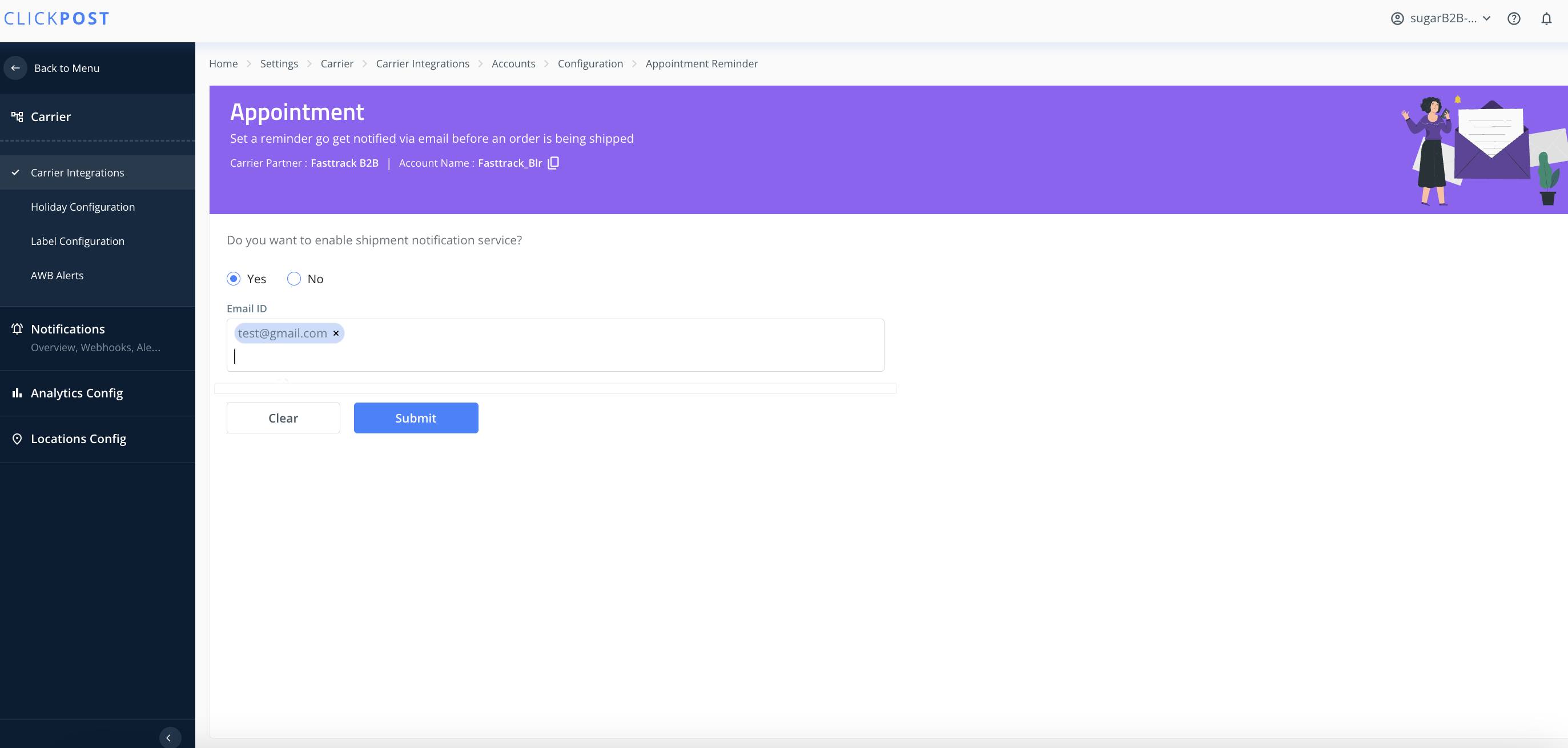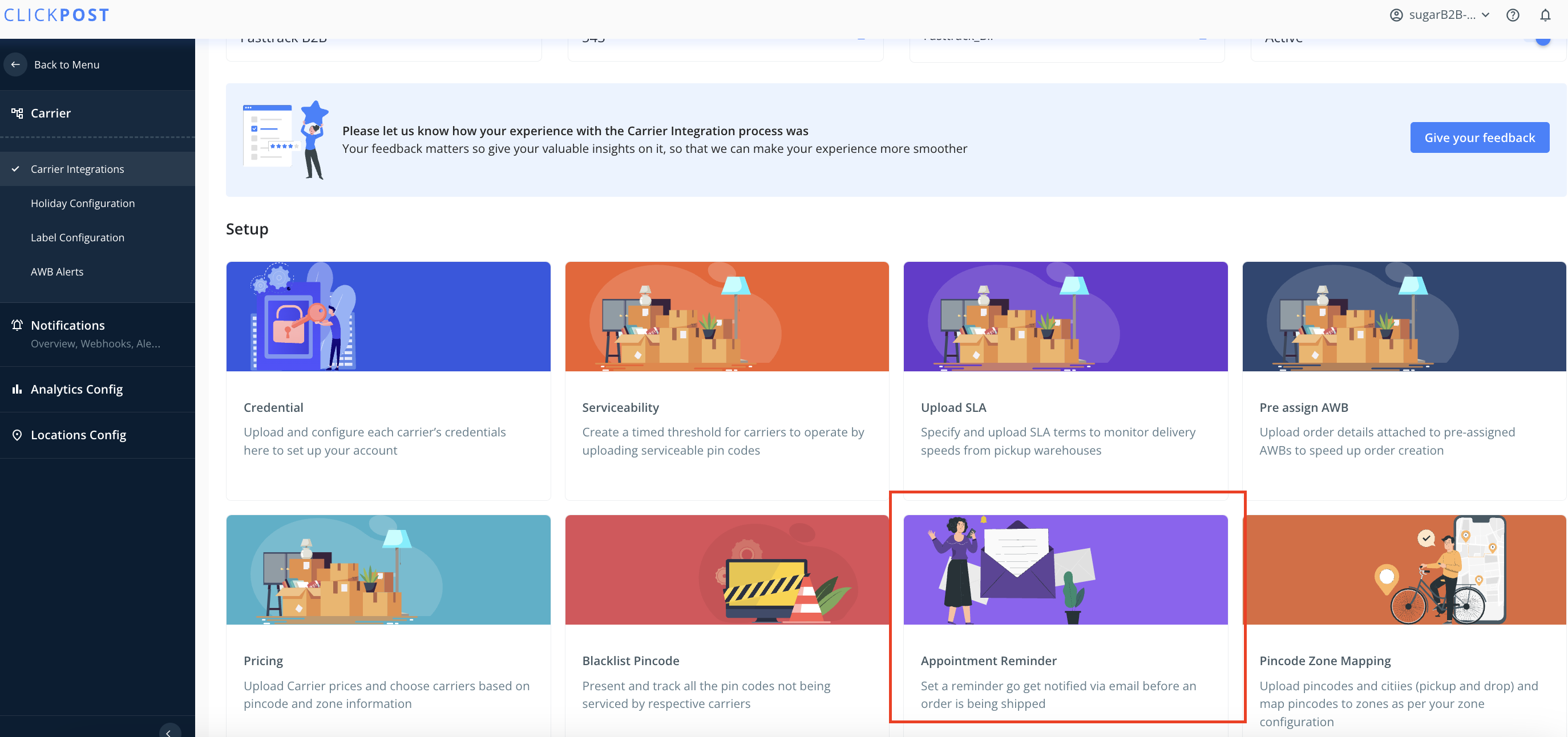 Login to dashboard-> in the left hamburger menu go to settings-> carrier integrations-> select the carrier-> select the account-> click on appointment reminder-> add courier POC email IDs