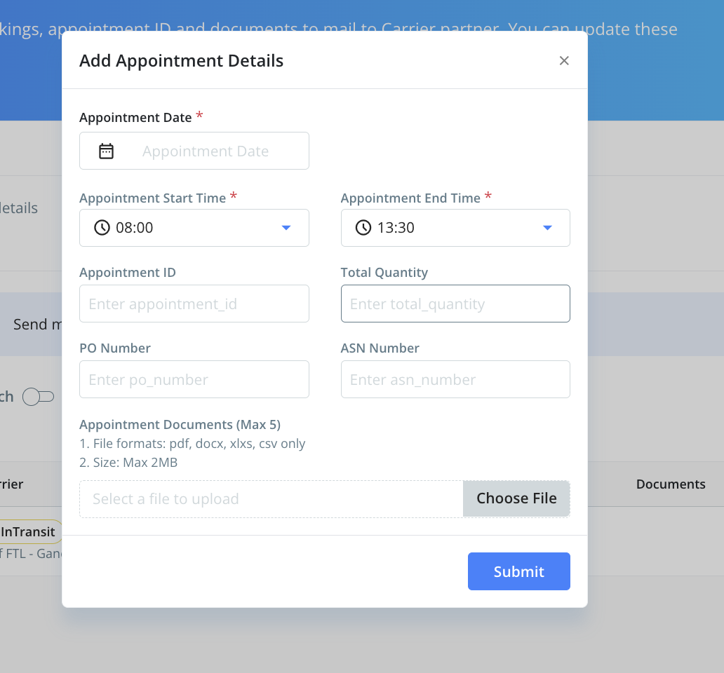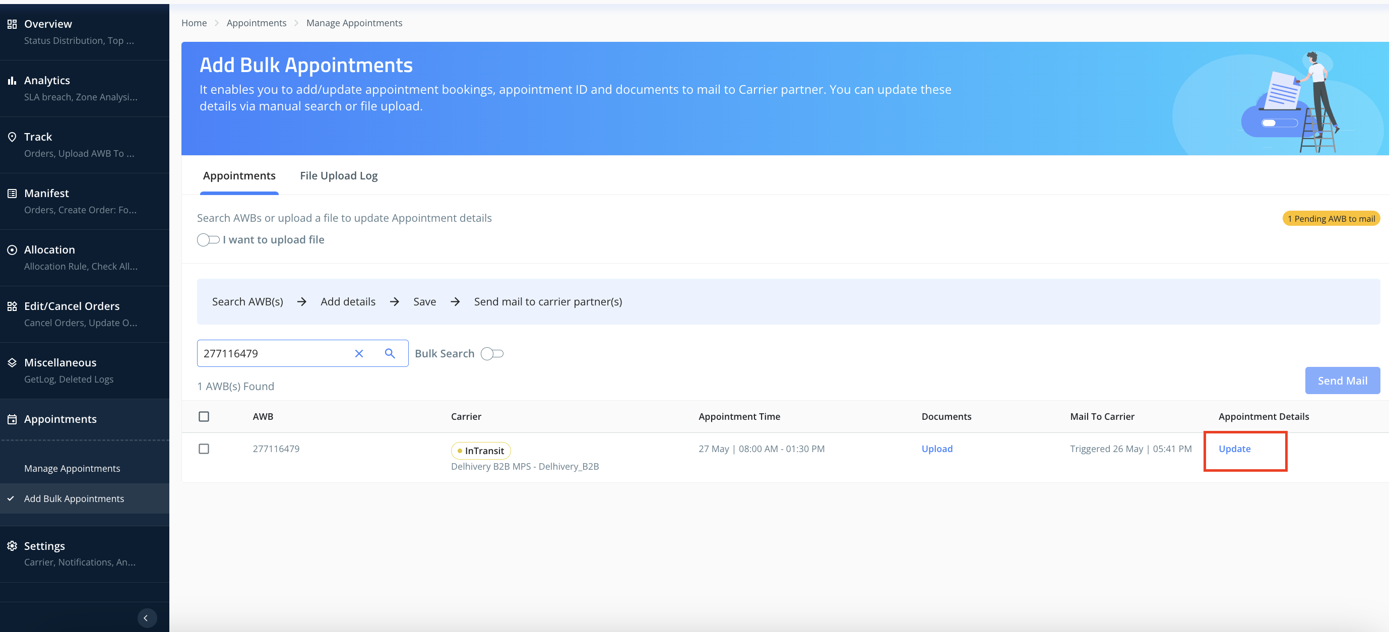 If you have added the details for appointment for any AWB(s)and you wish to update the same then go to appointment tab click on edit appointment and update the time slot and email communications will be triggered accordingly.