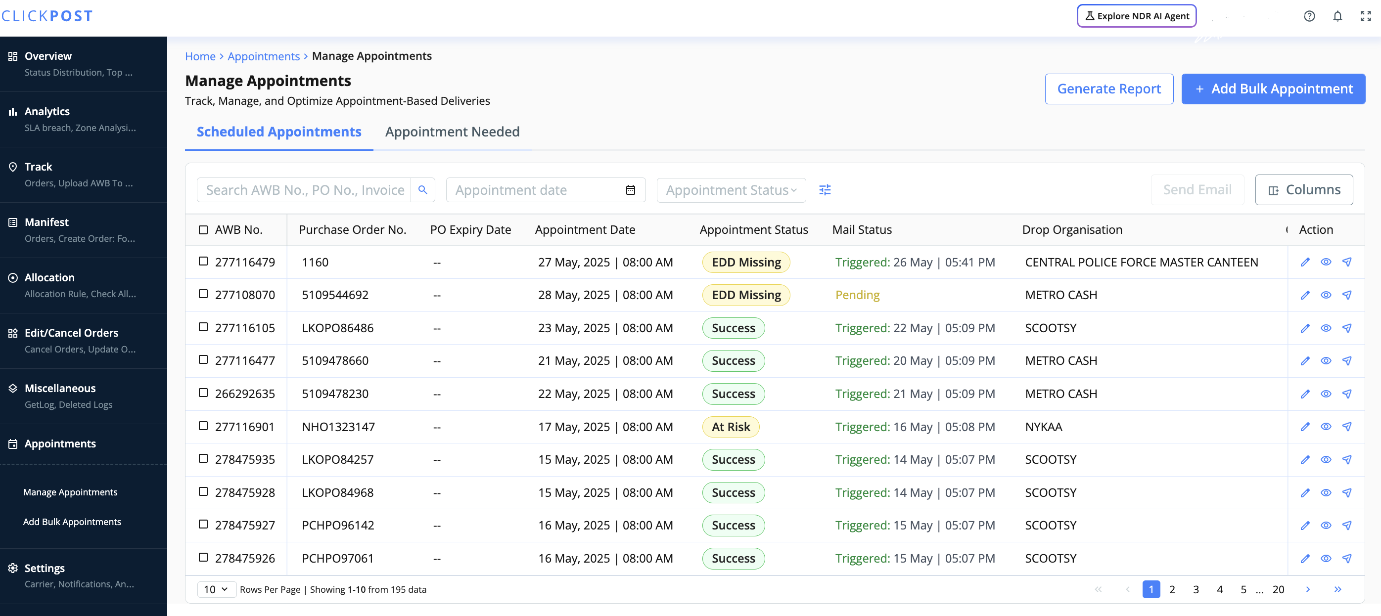Go to appointments tab in hamburger menu-> go to Manage Appointments-> here you will see comprehensive view of all shipments with appointments and the one who may require appointments and can download report of same as well from the appointment dashboard