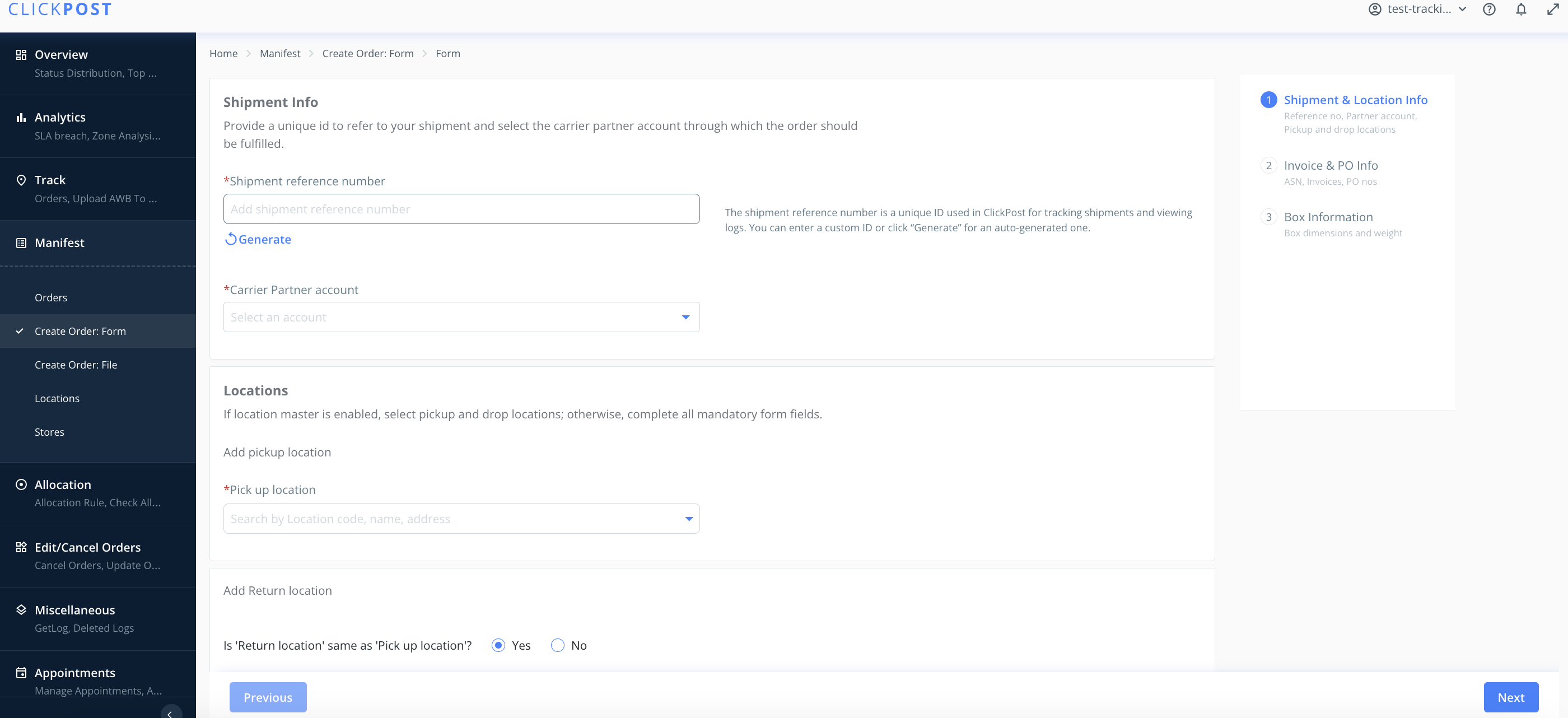 Outlined are the steps below to create orders via carriers via form functionality of clickpost dashboard.