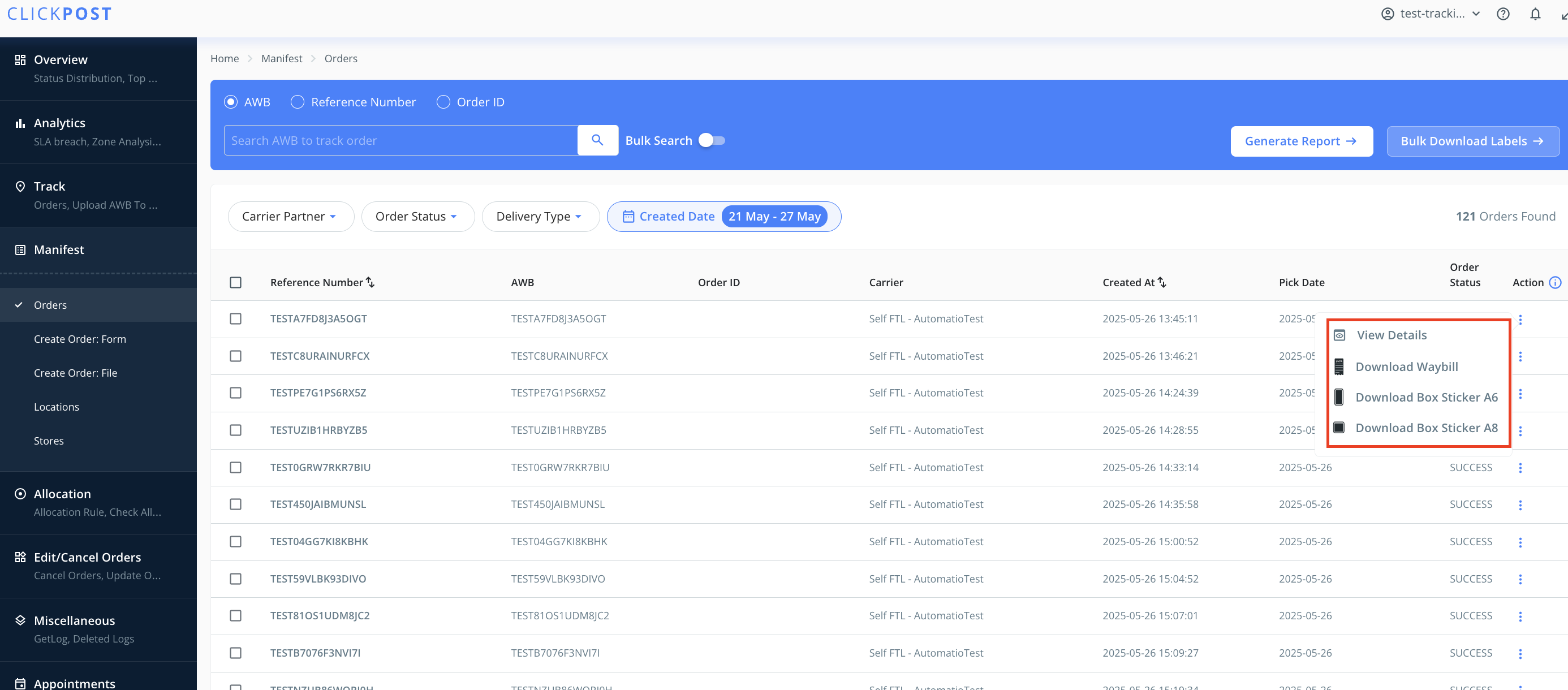 Step 5: Post successfull AWB generation you can download Waybill and Box stickers (A6 and A8) from dashboard. The screenshot of same is attached below.