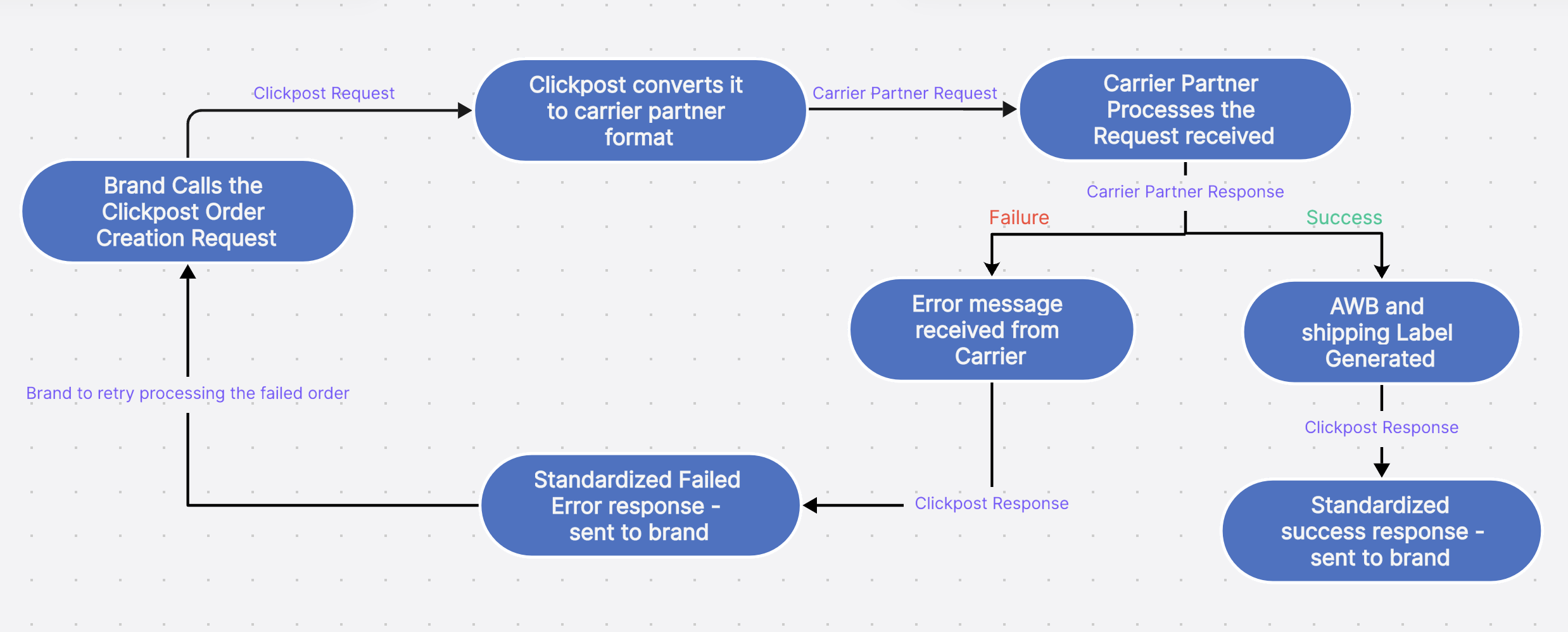 Once a brand is integrated with Clickpost, they can easily assign any order to a courier partner. In response, the courier partner generates a tracking number (AWB/Airwaybill number) and a shipping label, which are shared back with Clickpost. This process of generating an AWB and label is referred to as Order Creation.