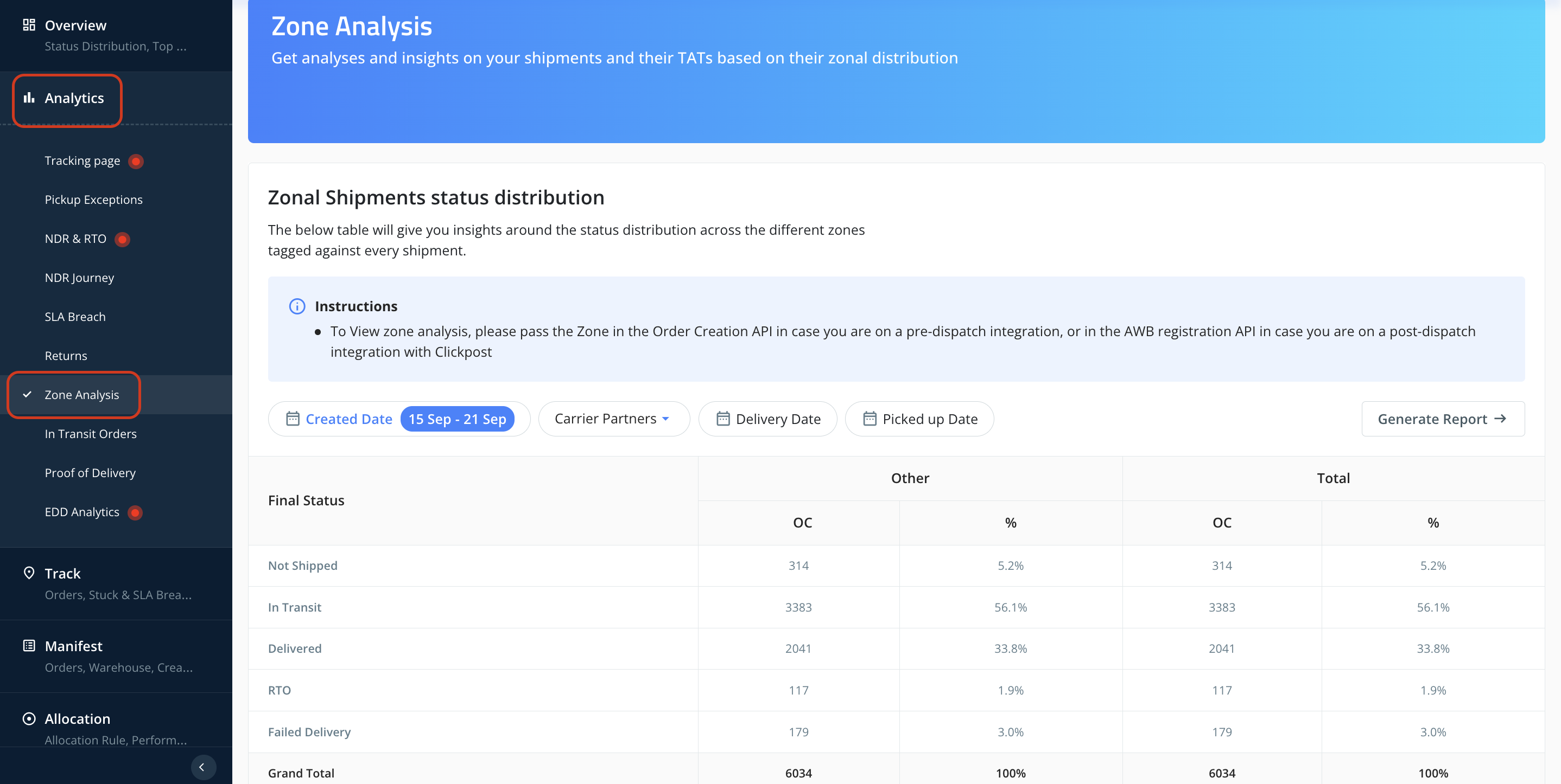 The Zone Analysis feature helps brands understand status distribution across different zones tagged against each shipment.