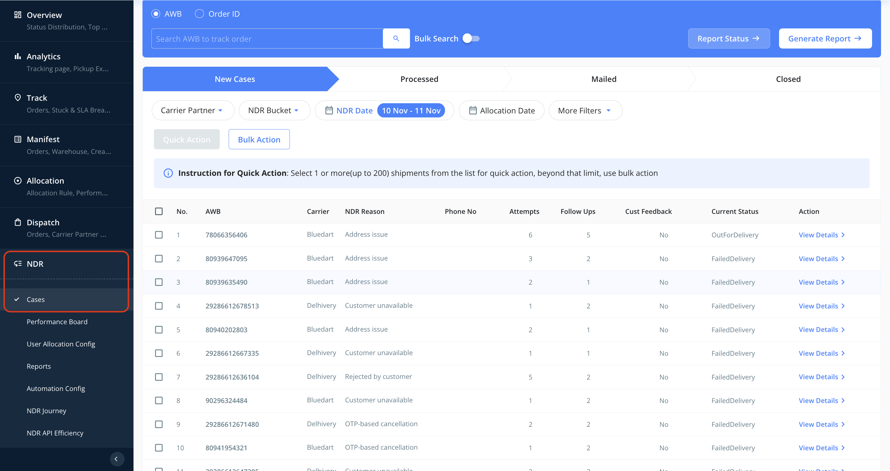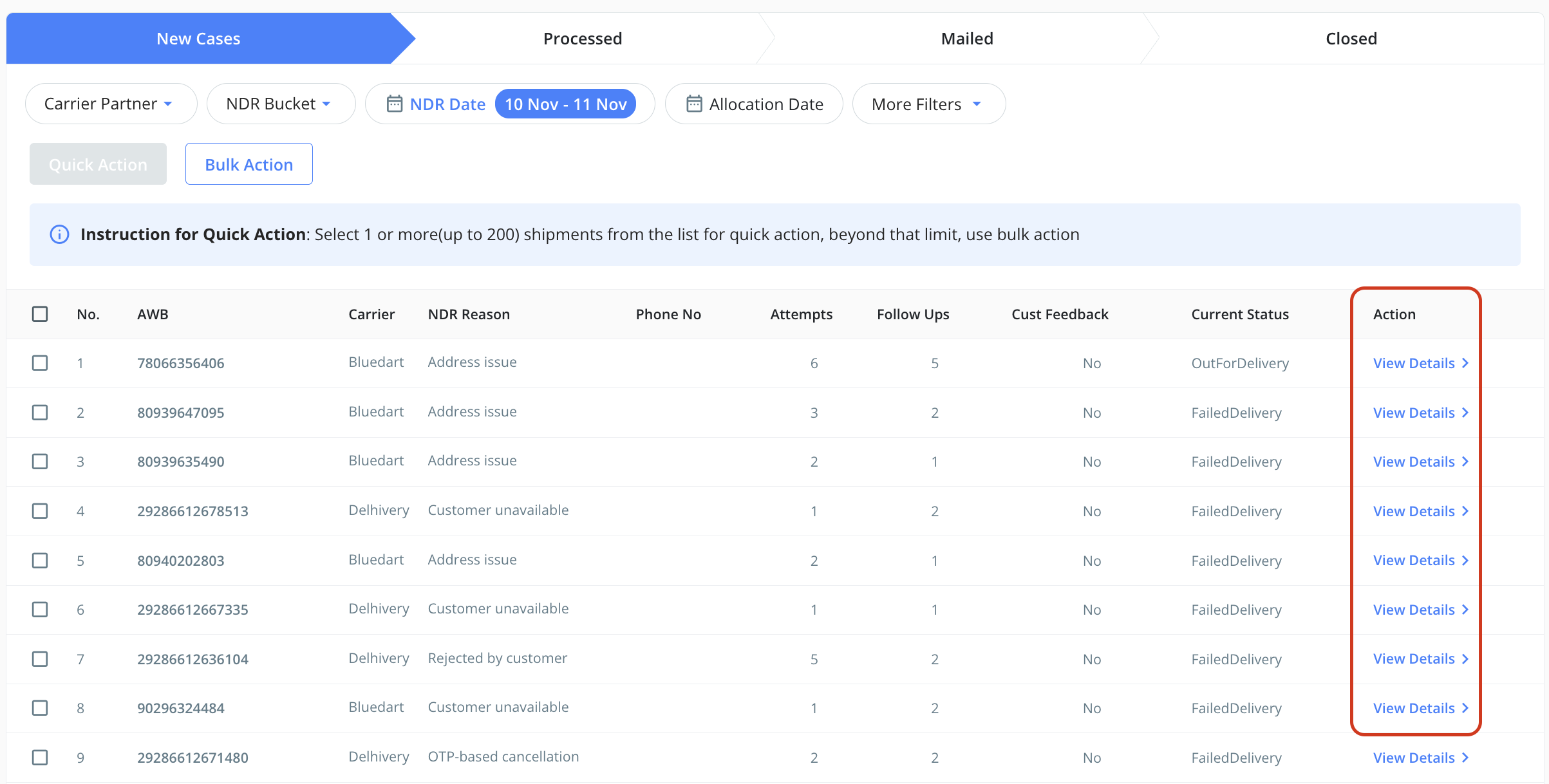 | New Cases → Processed | When an action is taken and the feedback is shared either by the operations team or the customer, the AWB moves to Processed until the same is shared further with the courier. |