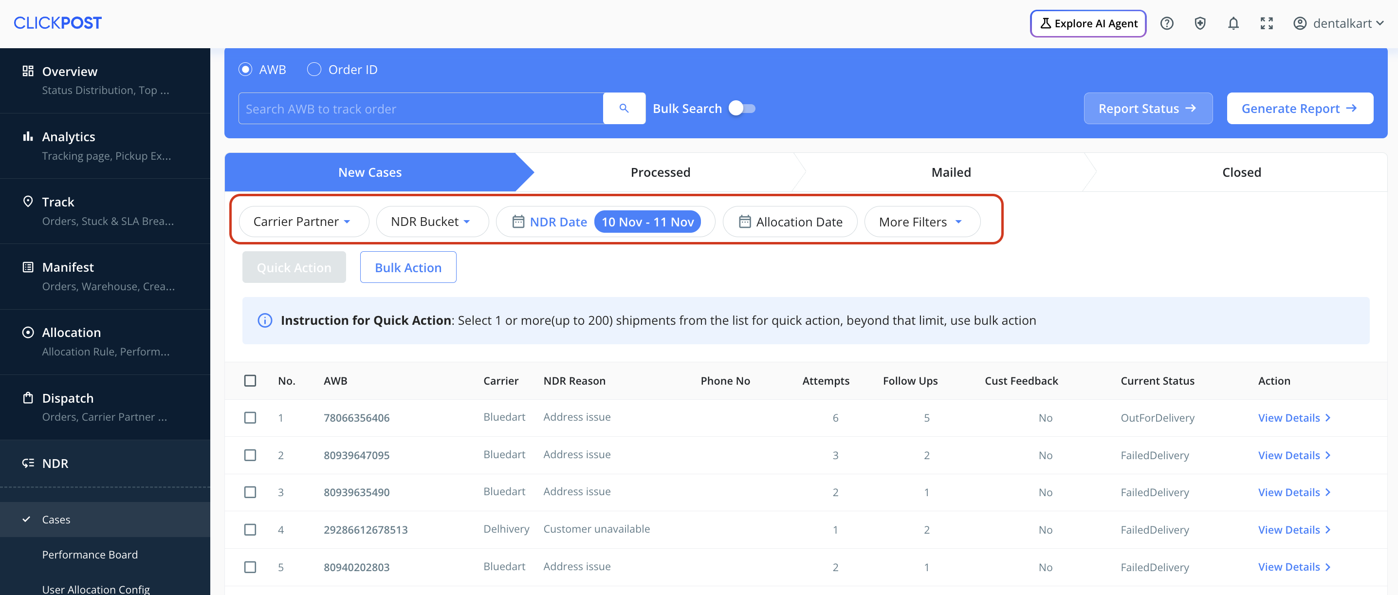 Whenever a delivery fails, ClickPost automatically creates an NDR case for that shipment.