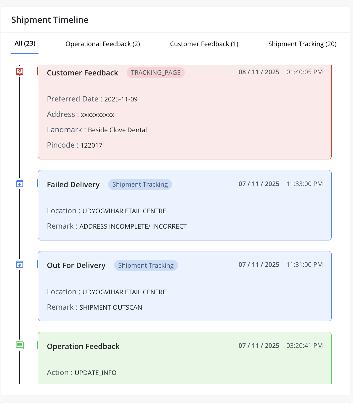 All responses submitted by the customer are instantly captured in the ClickPost system and reflected in red on the NDR case timeline for the respective shipment.