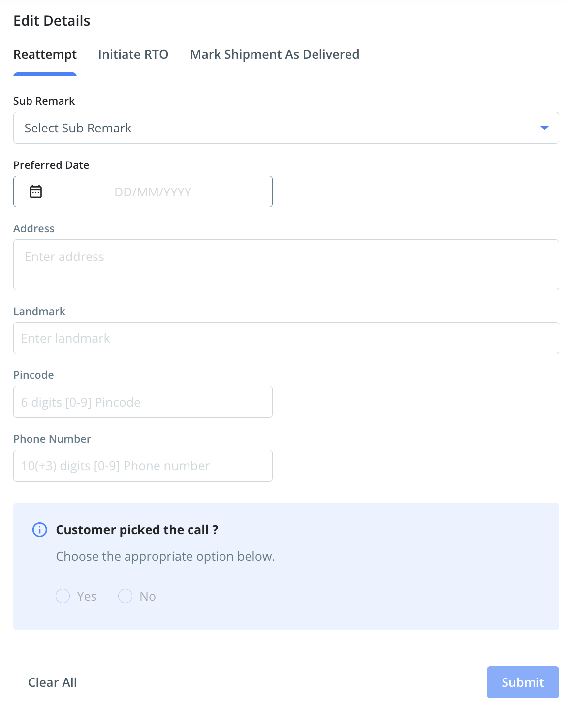 Action Description Reattempt Update customer details and preferred delivery date to request another delivery attempt from the courier. RTO (Return to Origin) If the customer has rejected the order, mark it for return to the warehouse. Mark as Delivered Use this if the order is already delivered but not yet updated in the courier’s tracking API.