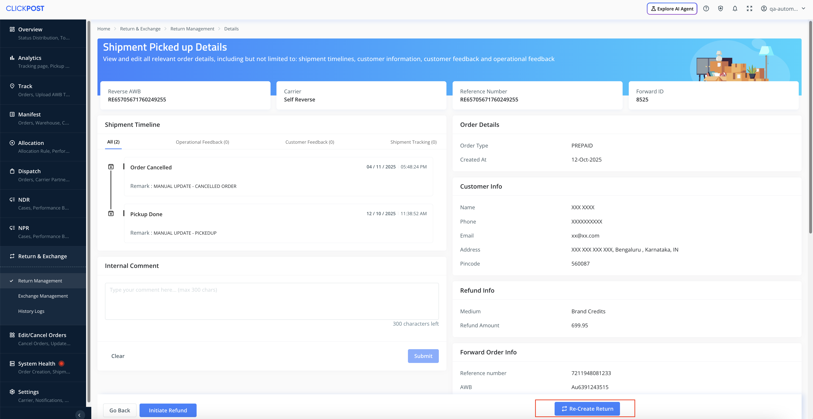For cancelled pickups of returned items, brands previously had to manually close the return request and raise a new one in situations such as courier miss, incorrect return reason selected by the customer, QC failure, etc. To reduce this manual effort, we have introduced the option to re-create a return request directly from the dashboard.