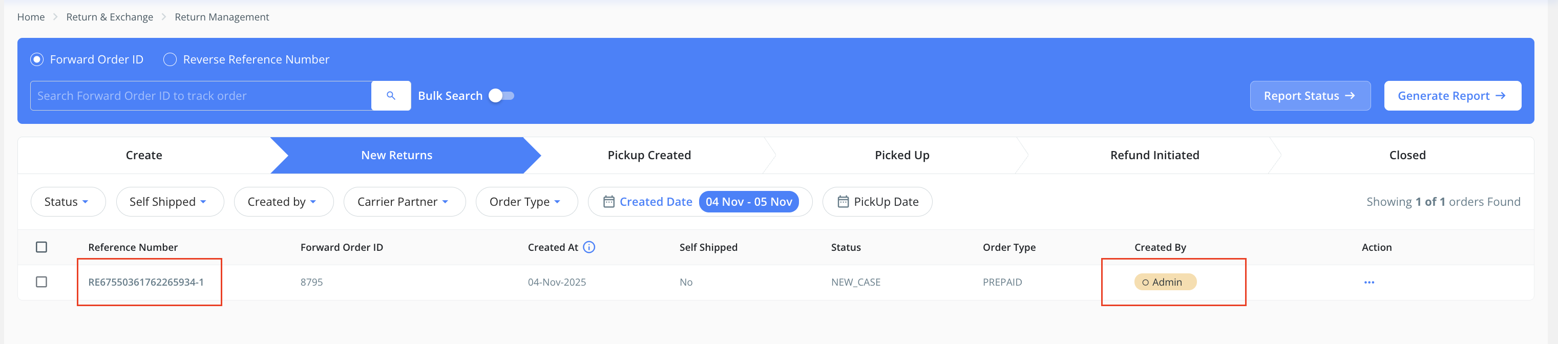 The Created By field will show “Admin” for all re-created return requests.