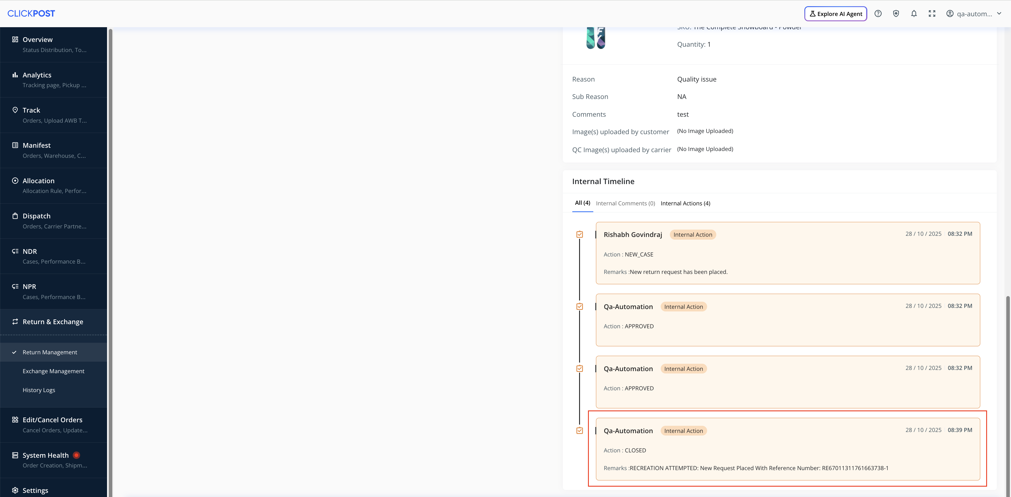 If you edit the return reason, add/remove images, etc., please ensure that you click Save first. Only after saving the updated details should you click Recreate to successfully submit the request.