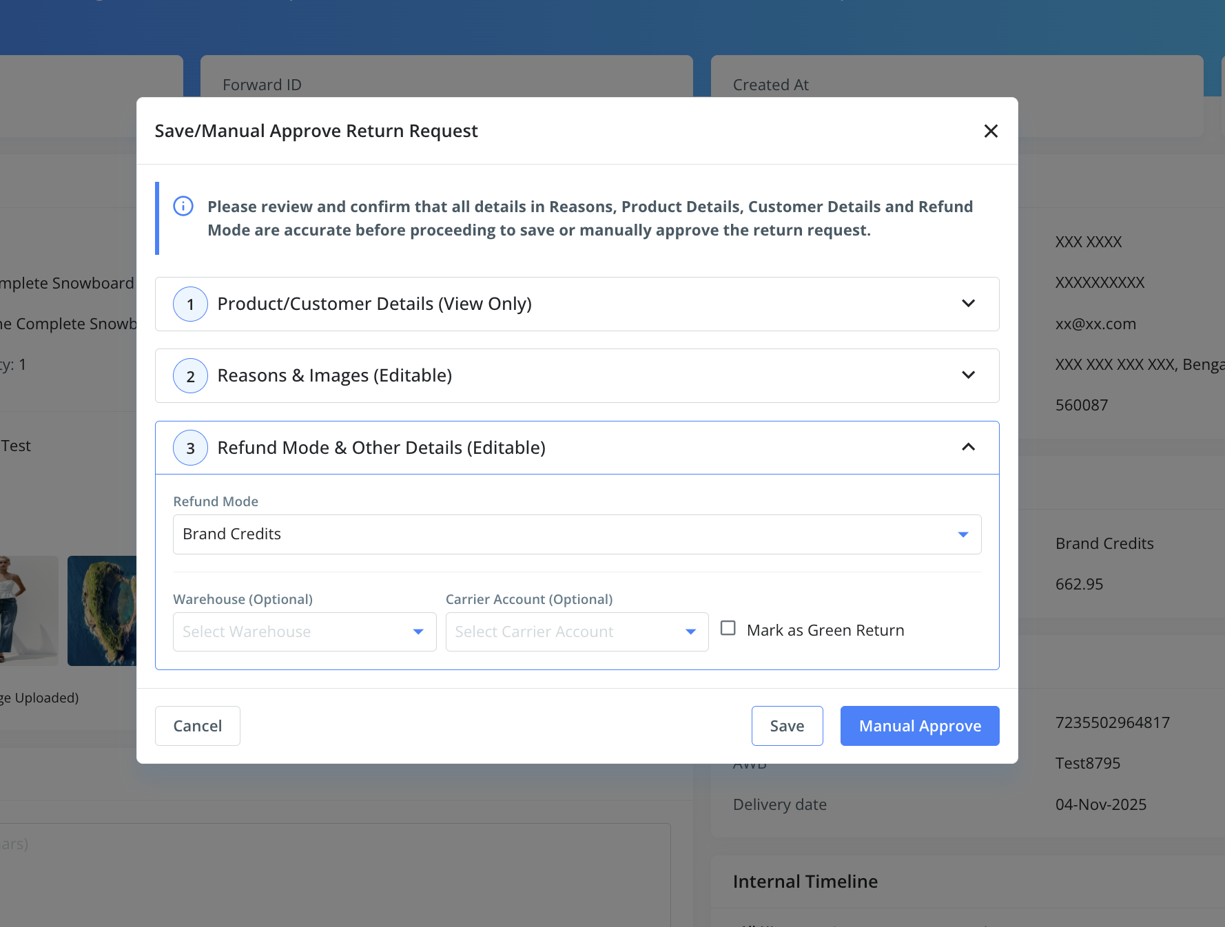 b. Dashboard users can edit fields such as return reason, sub-reason, and comments. They can also add or remove images uploaded by the customer.