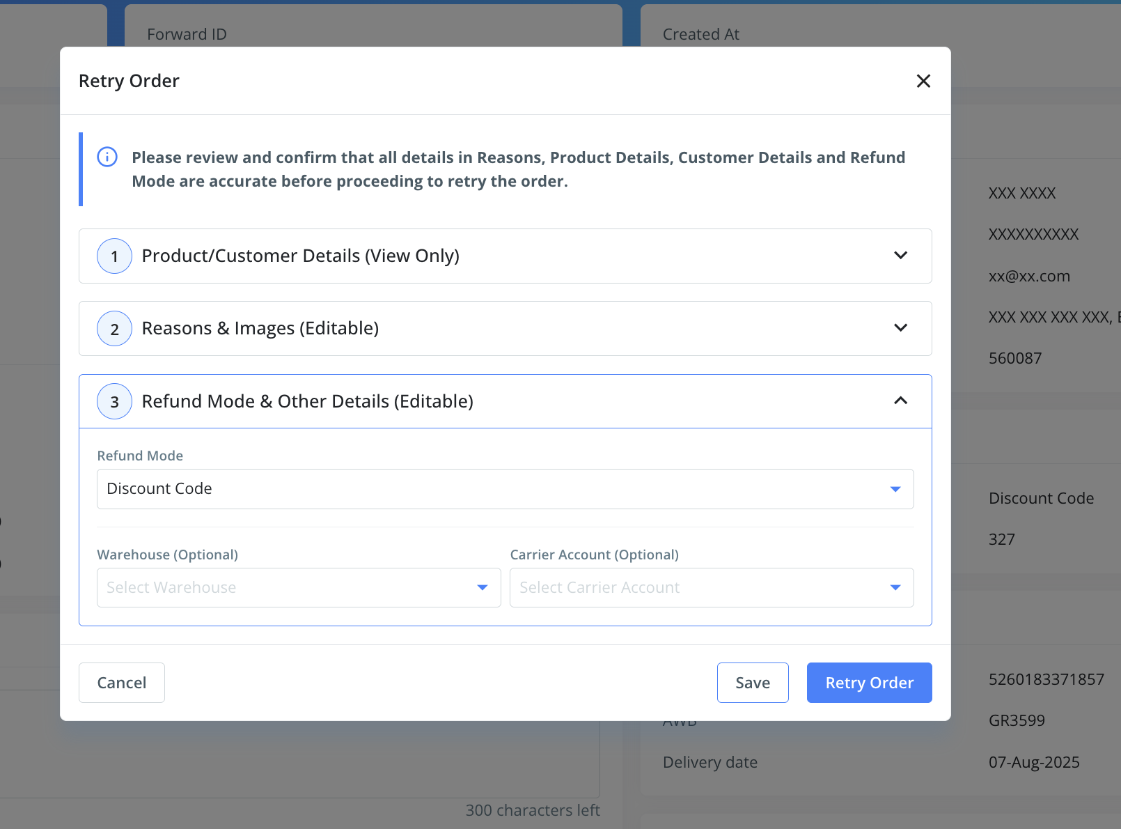 c. Users can also edit the refund mode, warehouse, and courier partner details.