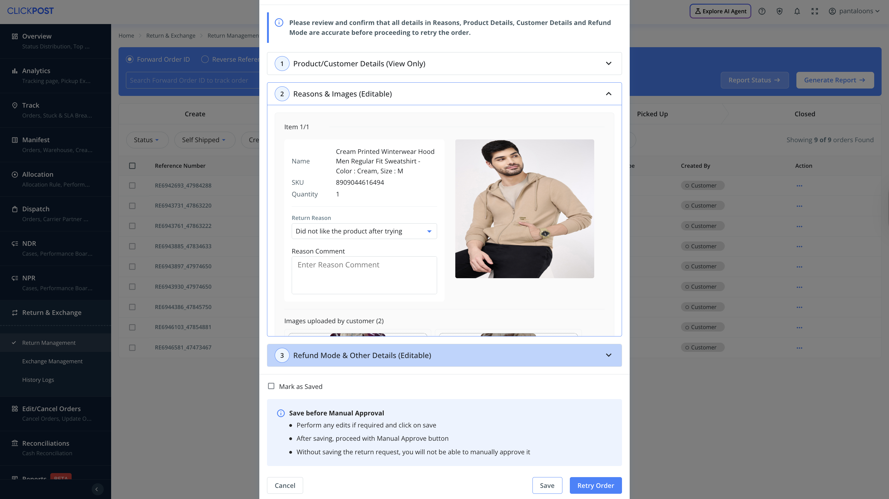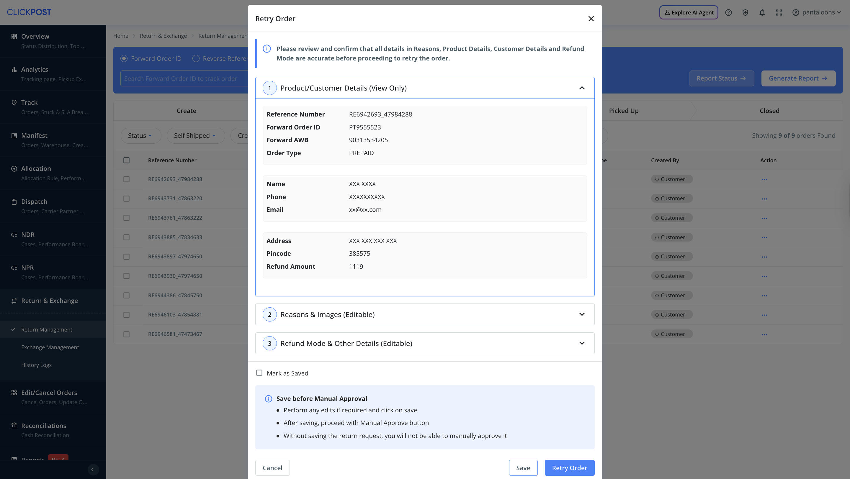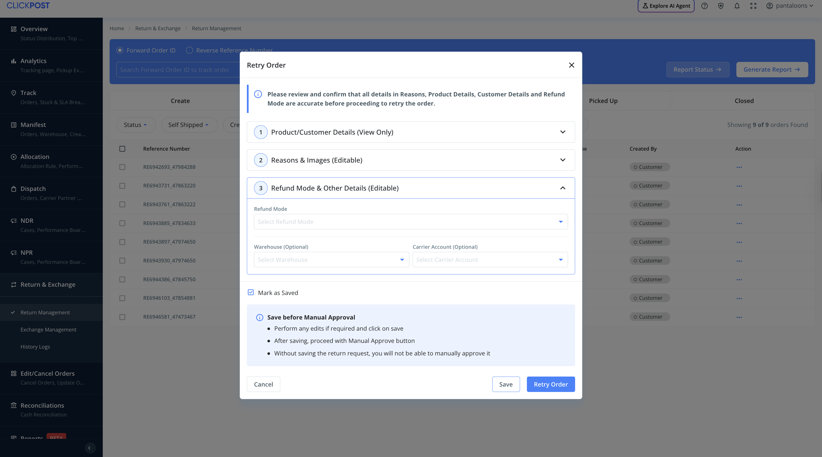 b) Retry Order → For return requests that failed under the New Returns tab
