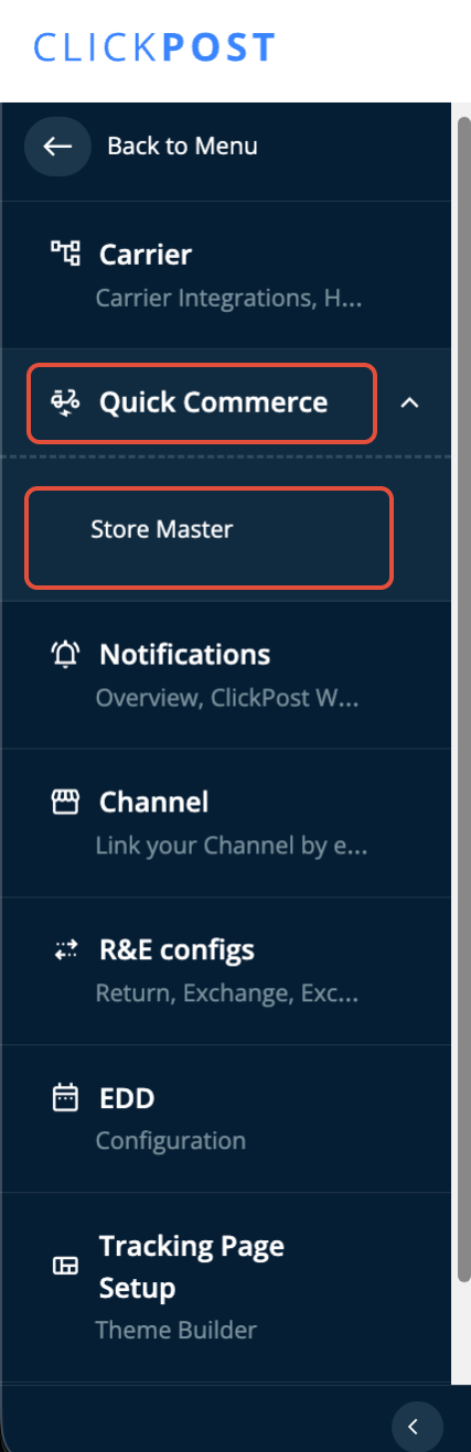Navigate to Settings > QuickCommerce > Store Master (as shown in the snapshot below).