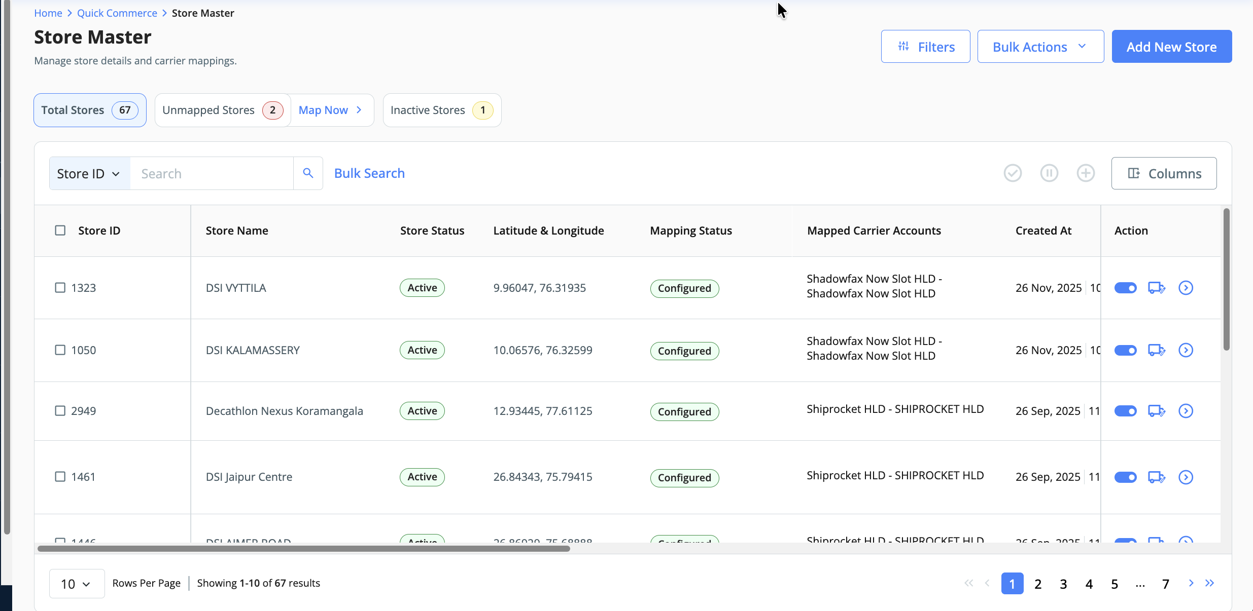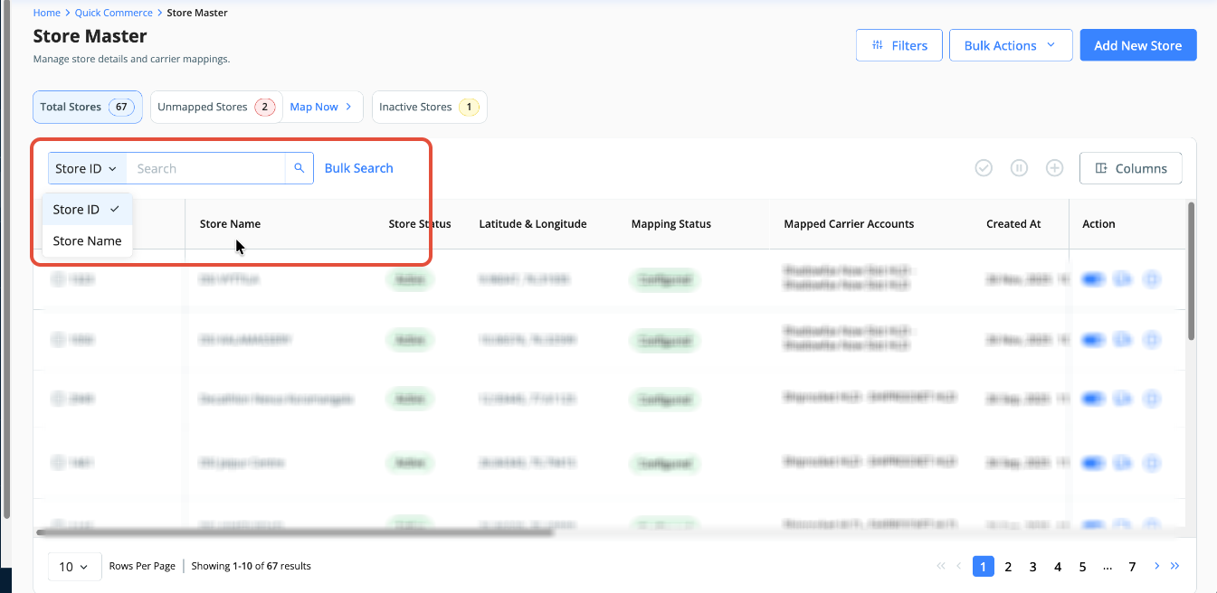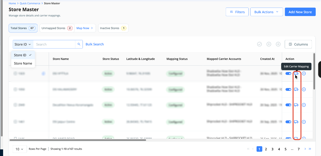 We've introduced the Store Master section on the dashboard for courier partner-to-store code mapping. This section also allows updating mapped data, such as latitude and longitude, email, and phone number.
