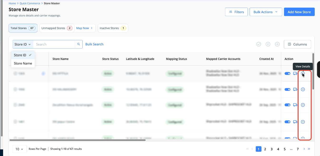 - Click on "View Details" to edit store information. To update courier partner mapping, click the carrier icon [refer to 2nd snapshot below].