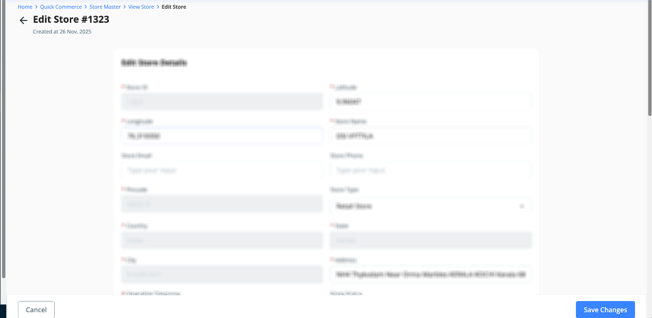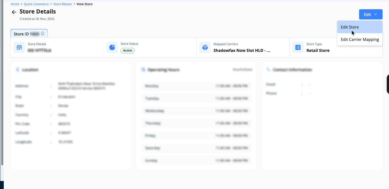 NOTE: If you're updating store latitude/longitude, please update it under Vendor Code mapping. This applies specifically to Shadowfax Now Slot and PicoXpress HLD courier partners. This step is mandatory because the courier partner expects the store ID in the order creation request body, which is provided via vendor code mapping. Any mismatch will cause order creation failure.