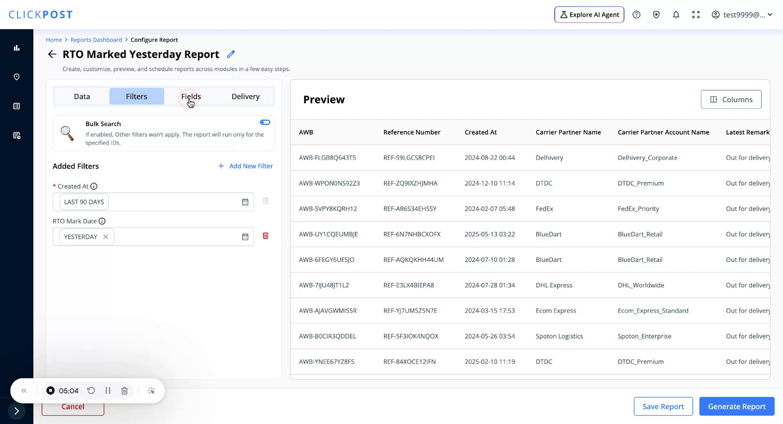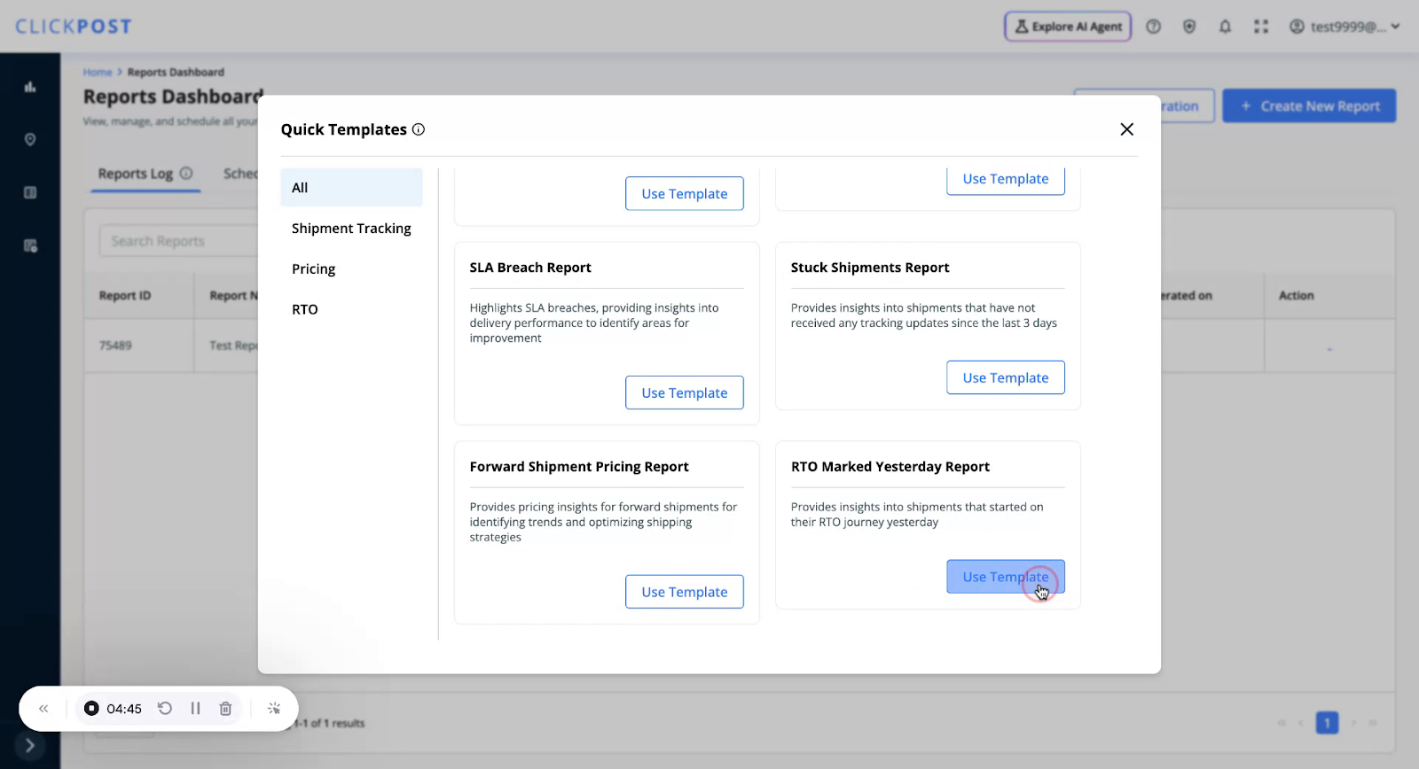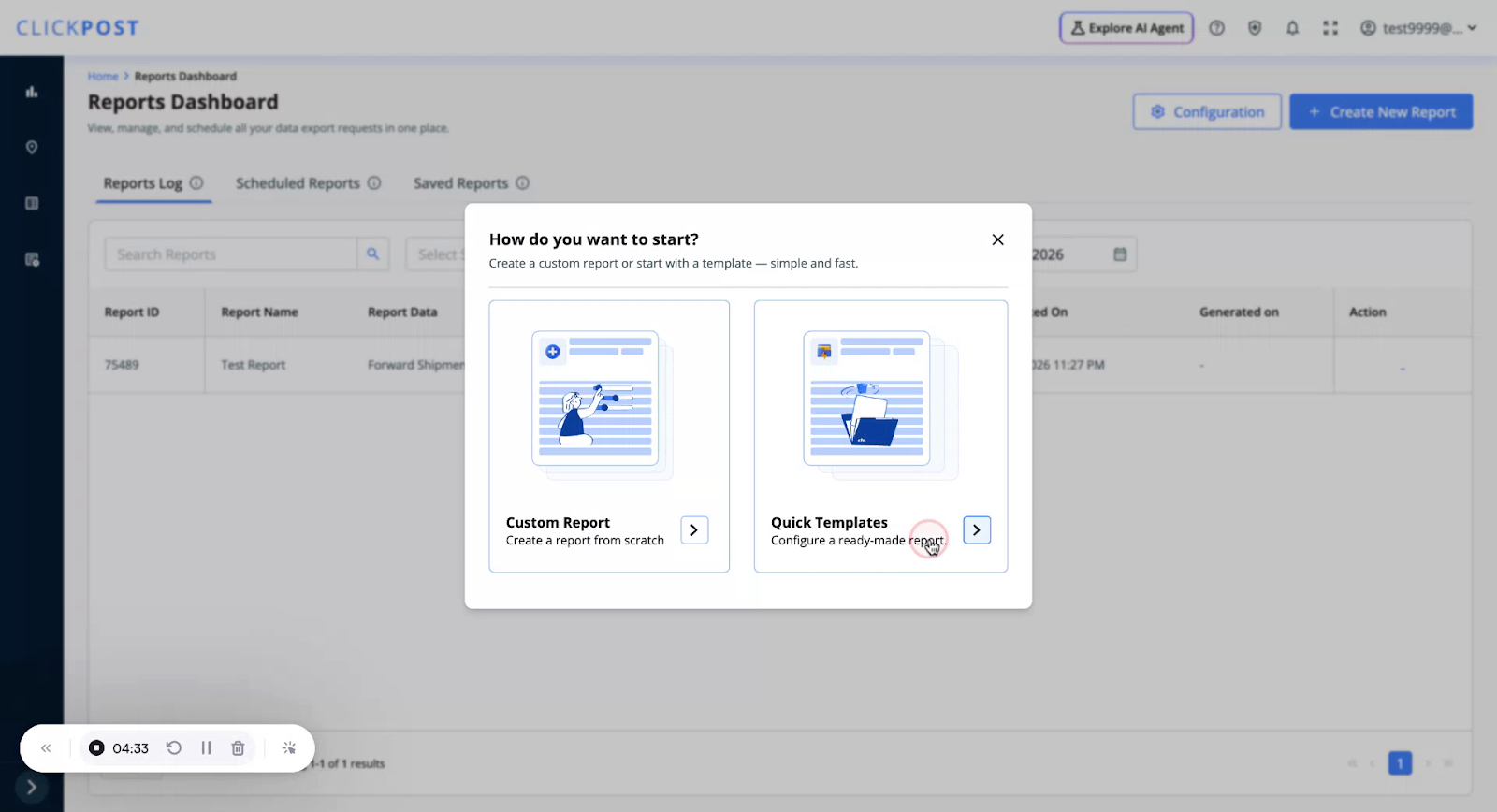 You can download pre-defined templates where filters and fields are already configured for you. To use a Quick Template, click on Create New Report
